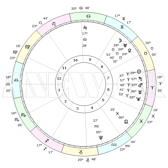 | | ΘΕΣΕΙΣ ΠΛΑΝΗΤΩΝ ΑΣΤΡΟΛΟΓΙΚΟΥ ΧΑΡΤΗ ΤΗΣ ΣΤΙΓΜΗΣ ΑΥΤΗΣ | | | | Πλανήτης | Ζώδιο | Μοίρες | Δεκαήμ. | Σε οίκο | Απόκλιση | | Ακμές των οίκων | | Ηλιος | Κριός | 29°33' | Τρίτο | 8 | 11 N 19 | | 1ος | 27°53' | Παρθένος | | Σελήνη | Ταύρος | 28°49' | Τρίτο | 9 | 24 N 48 | | 2ος | 24°19' | Ζυγός | | Ερμής | Κριός | 06°35' | Πρώτο | 7 | 00 N 12 | | 3ος | 24°40' | Σκορπιός | | Αφροδίτη | Ταύρος | 24°27' | Τρίτο | 8 | 19 N 15 | | 4ος | 27°38' | Τοξότης | | Αρης | Κριός | 07°36' | Πρώτο | 7 | 02 N 08 | | 5ος | 00°38' | Υδροχόος | | Δίας | Καρκίνος | 17°28' | Δεύτερο | 10 | 22 N 40 | | 6ος | 01°09' | Ιχθείς | | Κρόνος | Κριός | 07°56' | Πρώτο | 7 | 01 N 10 | | 7ος | 27°53' | Ιχθείς | | Ουρανός | Ταύρος | 29°40' | Τρίτο | 9 | 19 N 55 | | 8ος | 24°19' | Κριός | | Ποσειδώνας | Κριός | 02°53' | Πρώτο | 7 | 00 S 04 | | 9ος | 24°40' | Ταύρος | | Πλούτωνας | Υδροχόος | 05°27' | Πρώτο | 5 | 22 S 48 | | 10ος | 27°38' | Δίδυμοι | | Β. Δεσμός | Ιχθείς | 06°25' | Πρώτο | 6 | 09 S 09 | | 11ος | 00°38' | Λέων | | Ωροσκόπος | Παρθένος | 27°53' | Τρίτο | | | 12ος | 01°09' | Παρθένος | | Μεσουράνημα | Δίδυμοι | 27°38' | Τρίτο | | | |