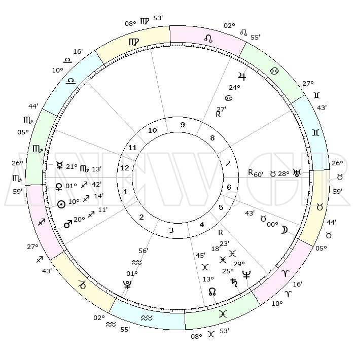 | | ΘΕΣΕΙΣ ΠΛΑΝΗΤΩΝ ΑΣΤΡΟΛΟΓΙΚΟΥ ΧΑΡΤΗ ΤΗΣ ΣΤΙΓΜΗΣ ΑΥΤΗΣ | | | | Πλανήτης | Ζώδιο | Μοίρες | Δεκαήμ. | Σε οίκο | Απόκλιση | | Ακμές των οίκων | | Ηλιος | Τοξότης | 10°12' | Δεύτερο | 1 | 21 S 58 | | 1ος | 16°54' | Σκορπιός | | Σελήνη | Ταύρος | 00°12' | Πρώτο | 6 | 14 N 55 | | 2ος | 16°33' | Τοξότης | | Ερμής | Σκορπιός | 21°12' | Τρίτο | 1 | 15 S 32 | | 3ος | 20°17' | Αιγόκερως | | Αφροδίτη | Τοξότης | 01°39' | Πρώτο | 1 | 19 S 50 | | 4ος | 25°41' | Υδροχόος | | Αρης | Τοξότης | 20°09' | Τρίτο | 2 | 23 S 44 | | 5ος | 27°59' | Ιχθείς | | Δίας | Καρκίνος | 24°27'R | Τρίτο | 9 | 21 N 23 | | 6ος | 24°47' | Κριός | | Κρόνος | Ιχθείς | 25°18' | Τρίτο | 4 | 04 S 02 | | 7ος | 16°54' | Ταύρος | | Ουρανός | Ταύρος | 28°60'R | Τρίτο | 7 | 19 N 44 | | 8ος | 16°33' | Δίδυμοι | | Ποσειδώνας | Ιχθείς | 29°23'R | Τρίτο | 5 | 01 S 29 | | 9ος | 20°17' | Καρκίνος | | Πλούτωνας | Υδροχόος | 01°56' | Πρώτο | 3 | 23 S 24 | | 10ος | 25°41' | Λέων | | Β. Δεσμός | Ιχθείς | 13°45' | Δεύτερο | 4 | 06 S 23 | | 11ος | 27°59' | Παρθένος | | Ωροσκόπος | Σκορπιός | 16°54' | Δεύτερο | | | 12ος | 24°47' | Ζυγός | | Μεσουράνημα | Λέων | 25°41' | Τρίτο | | | |