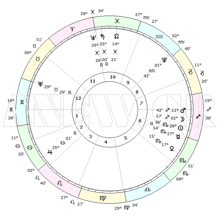 | | ΘΕΣΕΙΣ ΠΛΑΝΗΤΩΝ ΑΣΤΡΟΛΟΓΙΚΟΥ ΧΑΡΤΗ ΤΗΣ ΣΤΙΓΜΗΣ ΑΥΤΗΣ | | | | Πλανήτης | Ζώδιο | Μοίρες | Δεκαήμ. | Σε οίκο | Απόκλιση | | Ακμές των οίκων | | Ηλιος | Σκορπιός | 28°32' | Τρίτο | 7 | 19 S 50 | | 1ος | 22°54' | Ταύρος | | Σελήνη | Τοξότης | 02°09' | Πρώτο | 7 | 25 S 22 | | 2ος | 19°14' | Δίδυμοι | | Ερμής | Σκορπιός | 27°60'R | Τρίτο | 7 | 19 S 06 | | 3ος | 10°58' | Καρκίνος | | Αφροδίτη | Σκορπιός | 17°10' | Δεύτερο | 6 | 15 S 57 | | 4ος | 03°17' | Λέων | | Αρης | Τοξότης | 11°39' | Δεύτερο | 7 | 22 S 45 | | 5ος | 00°35' | Παρθένος | | Δίας | Καρκίνος | 25°01'R | Τρίτο | 3 | 21 N 15 | | 6ος | 07°49' | Ζυγός | | Κρόνος | Ιχθείς | 25°20'R | Τρίτο | 11 | 04 S 04 | | 7ος | 22°54' | Σκορπιός | | Ουρανός | Ταύρος | 29°29'R | Τρίτο | 1 | 19 N 50 | | 8ος | 19°14' | Τοξότης | | Ποσειδώνας | Ιχθείς | 29°29'R | Τρίτο | 11 | 01 S 27 | | 9ος | 10°58' | Αιγόκερως | | Πλούτωνας | Υδροχόος | 01°42' | Πρώτο | 9 | 23 S 27 | | 10ος | 03°17' | Υδροχόος | | Β. Δεσμός | Ιχθείς | 14°22' | Δεύτερο | 11 | 06 S 09 | | 11ος | 00°35' | Ιχθείς | | Ωροσκόπος | Ταύρος | 22°54' | Τρίτο | | | 12ος | 07°49' | Κριός | | Μεσουράνημα | Υδροχόος | 03°17' | Πρώτο | | | |