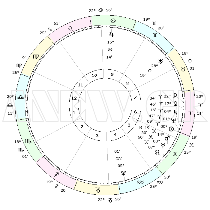 | | ΘΕΣΕΙΣ ΠΛΑΝΗΤΩΝ ΑΣΤΡΟΛΟΓΙΚΟΥ ΧΑΡΤΗ ΤΗΣ ΣΤΙΓΜΗΣ ΑΥΤΗΣ | | | | Πλανήτης | Ζώδιο | Μοίρες | Δεκαήμ. | Σε οίκο | Απόκλιση | | Ακμές των οίκων | | Ηλιος | Κριός | 00°04' | Πρώτο | 7 | 00 N 02 | | 1ος | 27°05' | Παρθένος | | Σελήνη | Κριός | 21°26' | Τρίτο | 7 | 11 N 39 | | 2ος | 23°27' | Ζυγός | | Ερμής | Ιχθείς | 08°30'R | Πρώτο | 6 | 07 S 26 | | 3ος | 23°46' | Σκορπιός | | Αφροδίτη | Κριός | 17°40' | Δεύτερο | 7 | 06 N 08 | | 4ος | 26°43' | Τοξότης | | Αρης | Ιχθείς | 14°15' | Δεύτερο | 6 | 07 S 11 | | 5ος | 29°44' | Αιγόκερως | | Δίας | Καρκίνος | 15°14' | Δεύτερο | 10 | 22 N 55 | | 6ος | 00°17' | Ιχθείς | | Κρόνος | Κριός | 04°15' | Πρώτο | 7 | 00 S 16 | | 7ος | 27°05' | Ιχθείς | | Ουρανός | Ταύρος | 28°19' | Τρίτο | 9 | 19 N 36 | | 8ος | 23°27' | Κριός | | Ποσειδώνας | Κριός | 01°47' | Πρώτο | 7 | 00 S 29 | | 9ος | 23°46' | Ταύρος | | Πλούτωνας | Υδροχόος | 05°01' | Πρώτο | 5 | 22 S 49 | | 10ος | 26°43' | Δίδυμοι | | Β. Δεσμός | Ιχθείς | 08°00' | Πρώτο | 6 | 08 S 34 | | 11ος | 29°44' | Καρκίνος | | Ωροσκόπος | Παρθένος | 27°05' | Τρίτο | | | 12ος | 00°17' | Παρθένος | | Μεσουράνημα | Δίδυμοι | 26°43' | Τρίτο | | | |