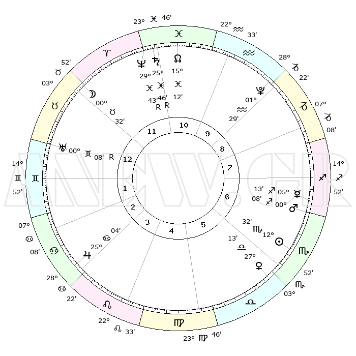 |  | ΘΕΣΕΙΣ ΠΛΑΝΗΤΩΝ ΑΣΤΡΟΛΟΓΙΚΟΥ ΧΑΡΤΗ ΤΗΣ ΣΤΙΓΜΗΣ ΑΥΤΗΣ |  |   |  | Πλανήτης | Ζώδιο | Μοίρες | Δεκαήμ. | Σε οίκο | Απόκλιση |   | Ακμές των οίκων |  | Ηλιος | Σκορπιός | 12°22' | Δεύτερο | 8 | 15 S 33 |   | 1ος | 20°37' | Ιχθείς |  | Σελήνη | Κριός | 27°59' | Τρίτο | 1 | 13 N 53 |   | 2ος | 03°01' | Ταύρος |  | Ερμής | Τοξότης | 05°07' | Πρώτο | 9 | 23 S 56 |   | 3ος | 01°56' | Δίδυμοι |  | Αφροδίτη | Ζυγός | 27°01' | Τρίτο | 7 | 09 S 05 |   | 4ος | 24°43' | Δίδυμοι |  | Αρης | Τοξότης | 00°01' | Πρώτο | 8 | 20 S 34 |   | 5ος | 16°40' | Καρκίνος |  | Δίας | Καρκίνος | 25°04' | Τρίτο | 5 | 21 N 12 |   | 6ος | 12°43' | Λέων |  | Κρόνος | Ιχθείς | 25°46'R | Τρίτο | 1 | 03 S 56 |   | 7ος | 20°37' | Παρθένος |  | Ουρανός | Δίδυμοι | 00°08'R | Πρώτο | 2 | 19 N 58 |   | 8ος | 03°01' | Σκορπιός |  | Ποσειδώνας | Ιχθείς | 29°43'R | Τρίτο | 1 | 01 S 22 |   | 9ος | 01°56' | Τοξότης |  | Πλούτωνας | Υδροχόος | 01°29' | Πρώτο | 11 | 23 S 30 |   | 10ος | 24°43' | Τοξότης |  | Β. Δεσμός | Ιχθείς | 15°13' | Δεύτερο | 12 | 05 S 50 |   | 11ος | 16°40' | Αιγόκερως |  | Ωροσκόπος | Ιχθείς | 20°37' | Τρίτο |   |   | 12ος | 12°43' | Υδροχόος |  | Μεσουράνημα | Τοξότης | 24°43' | Τρίτο |   |   |   |
