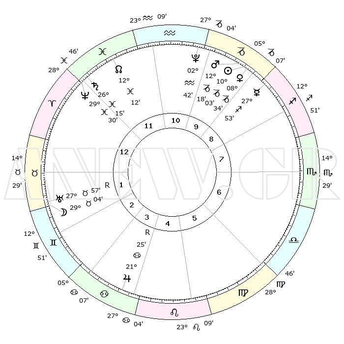 | | ΘΕΣΕΙΣ ΠΛΑΝΗΤΩΝ ΑΣΤΡΟΛΟΓΙΚΟΥ ΧΑΡΤΗ ΤΗΣ ΣΤΙΓΜΗΣ ΑΥΤΗΣ | | | | Πλανήτης | Ζώδιο | Μοίρες | Δεκαήμ. | Σε οίκο | Απόκλιση | | Ακμές των οίκων | | Ηλιος | Αιγόκερως | 09°58' | Πρώτο | 10 | 23 S 03 | | 1ος | 00°28' | Κριός | | Σελήνη | Ταύρος | 27°53' | Τρίτο | 2 | 24 N 29 | | 2ος | 10°39' | Ταύρος | | Ερμής | Τοξότης | 27°46' | Τρίτο | 9 | 23 S 55 | | 3ος | 07°59' | Δίδυμοι | | Αφροδίτη | Αιγόκερως | 08°28' | Πρώτο | 10 | 23 S 39 | | 4ος | 00°16' | Καρκίνος | | Αρης | Αιγόκερως | 12°15' | Δεύτερο | 10 | 23 S 45 | | 5ος | 22°35' | Καρκίνος | | Δίας | Καρκίνος | 21°26'R | Τρίτο | 4 | 21 N 58 | | 6ος | 20°04' | Λέων | | Κρόνος | Ιχθείς | 26°15' | Τρίτο | 12 | 03 S 34 | | 7ος | 00°28' | Ζυγός | | Ουρανός | Ταύρος | 27°58'R | Τρίτο | 2 | 19 N 30 | | 8ος | 10°39' | Σκορπιός | | Ποσειδώνας | Ιχθείς | 29°30' | Τρίτο | 12 | 01 S 25 | | 9ος | 07°59' | Τοξότης | | Πλούτωνας | Υδροχόος | 02°42' | Πρώτο | 11 | 23 S 13 | | 10ος | 00°16' | Αιγόκερως | | Β. Δεσμός | Ιχθείς | 12°12' | Δεύτερο | 12 | 06 S 59 | | 11ος | 22°35' | Αιγόκερως | | Ωροσκόπος | Κριός | 00°28' | Πρώτο | | | 12ος | 20°04' | Υδροχόος | | Μεσουράνημα | Αιγόκερως | 00°16' | Πρώτο | | | |