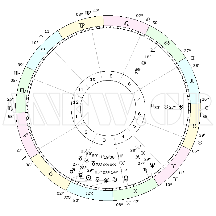 | | ΘΕΣΕΙΣ ΠΛΑΝΗΤΩΝ ΑΣΤΡΟΛΟΓΙΚΟΥ ΧΑΡΤΗ ΤΗΣ ΣΤΙΓΜΗΣ ΑΥΤΗΣ | | | | Πλανήτης | Ζώδιο | Μοίρες | Δεκαήμ. | Σε οίκο | Απόκλιση | | Ακμές των οίκων | | Ηλιος | Αιγόκερως | 29°53' | Τρίτο | 3 | 20 S 10 | | 1ος | 29°31' | Ζυγός | | Σελήνη | Υδροχόος | 12°55' | Δεύτερο | 4 | 19 S 09 | | 2ος | 27°54' | Σκορπιός | | Ερμής | Αιγόκερως | 28°46' | Τρίτο | 3 | 22 S 22 | | 3ος | 29°49' | Τοξότης | | Αφροδίτη | Υδροχόος | 03°03' | Πρώτο | 3 | 20 S 33 | | 4ος | 03°59' | Υδροχόος | | Αρης | Αιγόκερως | 27°20' | Τρίτο | 3 | 21 S 40 | | 5ος | 06°54' | Ιχθείς | | Δίας | Καρκίνος | 18°49'R | Δεύτερο | 9 | 22 N 23 | | 6ος | 05°37' | Κριός | | Κρόνος | Ιχθείς | 27°39' | Τρίτο | 5 | 02 S 57 | | 7ος | 29°31' | Κριός | | Ουρανός | Ταύρος | 27°33'R | Τρίτο | 7 | 19 N 25 | | 8ος | 27°54' | Ταύρος | | Ποσειδώνας | Ιχθείς | 29°50' | Τρίτο | 5 | 01 S 17 | | 9ος | 29°49' | Δίδυμοι | | Πλούτωνας | Υδροχόος | 03°19' | Πρώτο | 3 | 23 S 06 | | 10ος | 03°59' | Λέων | | Β. Δεσμός | Ιχθείς | 11°10' | Δεύτερο | 5 | 07 S 23 | | 11ος | 06°54' | Παρθένος | | Ωροσκόπος | Ζυγός | 29°31' | Τρίτο | | | 12ος | 05°37' | Ζυγός | | Μεσουράνημα | Λέων | 03°59' | Πρώτο | | | |