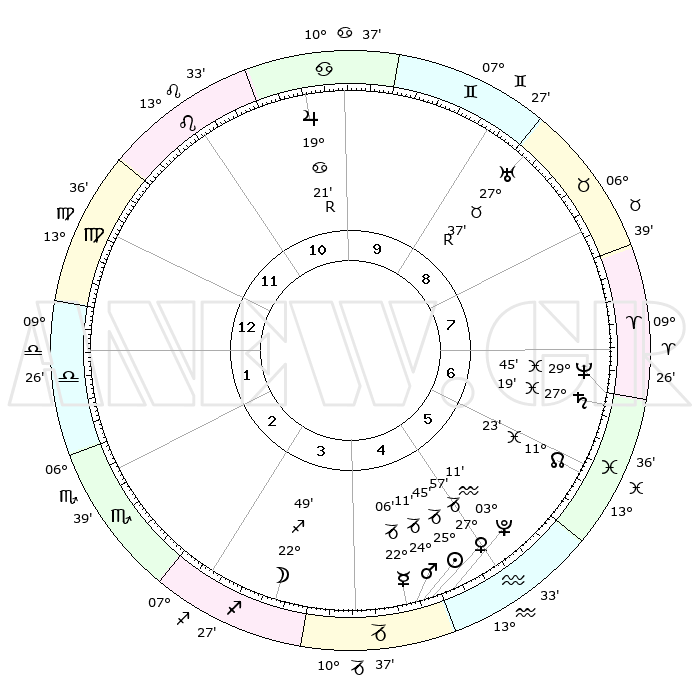 | | ΘΕΣΕΙΣ ΠΛΑΝΗΤΩΝ ΑΣΤΡΟΛΟΓΙΚΟΥ ΧΑΡΤΗ ΤΗΣ ΣΤΙΓΜΗΣ ΑΥΤΗΣ | | | | Πλανήτης | Ζώδιο | Μοίρες | Δεκαήμ. | Σε οίκο | Απόκλιση | | Ακμές των οίκων | | Ηλιος | Αιγόκερως | 25°41' | Τρίτο | 5 | 21 S 00 | | 1ος | 17°57' | Παρθένος | | Σελήνη | Τοξότης | 21°56' | Τρίτο | 4 | 28 S 12 | | 2ος | 13°34' | Ζυγός | | Ερμής | Αιγόκερως | 21°59' | Τρίτο | 5 | 23 S 27 | | 3ος | 13°28' | Σκορπιός | | Αφροδίτη | Αιγόκερως | 27°52' | Τρίτο | 5 | 21 S 34 | | 4ος | 16°24' | Τοξότης | | Αρης | Αιγόκερως | 24°08' | Τρίτο | 5 | 22 S 14 | | 5ος | 19°39' | Αιγόκερως | | Δίας | Καρκίνος | 19°22'R | Δεύτερο | 10 | 22 N 18 | | 6ος | 20°34' | Υδροχόος | | Κρόνος | Ιχθείς | 27°19' | Τρίτο | 7 | 03 S 06 | | 7ος | 17°57' | Ιχθείς | | Ουρανός | Ταύρος | 27°37'R | Τρίτο | 9 | 19 N 26 | | 8ος | 13°34' | Κριός | | Ποσειδώνας | Ιχθείς | 29°45' | Τρίτο | 7 | 01 S 19 | | 9ος | 13°28' | Ταύρος | | Πλούτωνας | Υδροχόος | 03°11' | Πρώτο | 5 | 23 S 07 | | 10ος | 16°24' | Δίδυμοι | | Β. Δεσμός | Ιχθείς | 11°23' | Δεύτερο | 6 | 07 S 18 | | 11ος | 19°39' | Καρκίνος | | Ωροσκόπος | Παρθένος | 17°57' | Δεύτερο | | | 12ος | 20°34' | Λέων | | Μεσουράνημα | Δίδυμοι | 16°24' | Δεύτερο | | | |