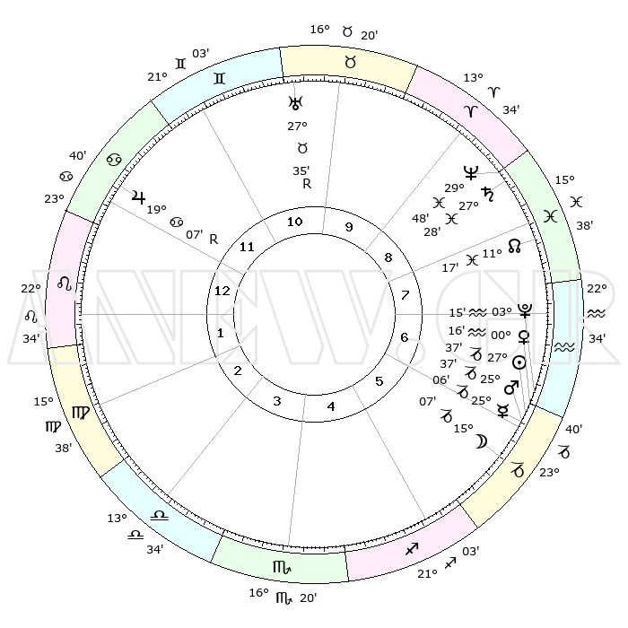 | | ΘΕΣΕΙΣ ΠΛΑΝΗΤΩΝ ΑΣΤΡΟΛΟΓΙΚΟΥ ΧΑΡΤΗ ΤΗΣ ΣΤΙΓΜΗΣ ΑΥΤΗΣ | | | | Πλανήτης | Ζώδιο | Μοίρες | Δεκαήμ. | Σε οίκο | Απόκλιση | | Ακμές των οίκων | | Ηλιος | Αιγόκερως | 27°33' | Τρίτο | 6 | 20 S 39 | | 1ος | 05°16' | Λέων | | Σελήνη | Αιγόκερως | 14°23' | Δεύτερο | 6 | 26 S 51 | | 2ος | 26°42' | Λέων | | Ερμής | Αιγόκερως | 25°00' | Τρίτο | 6 | 23 S 01 | | 3ος | 22°27' | Παρθένος | | Αφροδίτη | Υδροχόος | 00°11' | Πρώτο | 6 | 21 S 08 | | 4ος | 24°05' | Ζυγός | | Αρης | Αιγόκερως | 25°34' | Τρίτο | 6 | 21 S 59 | | 5ος | 29°57' | Σκορπιός | | Δίας | Καρκίνος | 19°07'R | Δεύτερο | 12 | 22 N 21 | | 6ος | 04°48' | Αιγόκερως | | Κρόνος | Ιχθείς | 27°28' | Τρίτο | 9 | 03 S 02 | | 7ος | 05°16' | Υδροχόος | | Ουρανός | Ταύρος | 27°35'R | Τρίτο | 10 | 19 N 26 | | 8ος | 26°42' | Υδροχόος | | Ποσειδώνας | Ιχθείς | 29°47' | Τρίτο | 9 | 01 S 18 | | 9ος | 22°27' | Ιχθείς | | Πλούτωνας | Υδροχόος | 03°15' | Πρώτο | 6 | 23 S 07 | | 10ος | 24°05' | Κριός | | Β. Δεσμός | Ιχθείς | 11°17' | Δεύτερο | 8 | 07 S 20 | | 11ος | 29°57' | Ταύρος | | Ωροσκόπος | Λέων | 05°16' | Πρώτο | | | 12ος | 04°48' | Καρκίνος | | Μεσουράνημα | Κριός | 24°05' | Τρίτο | | | |