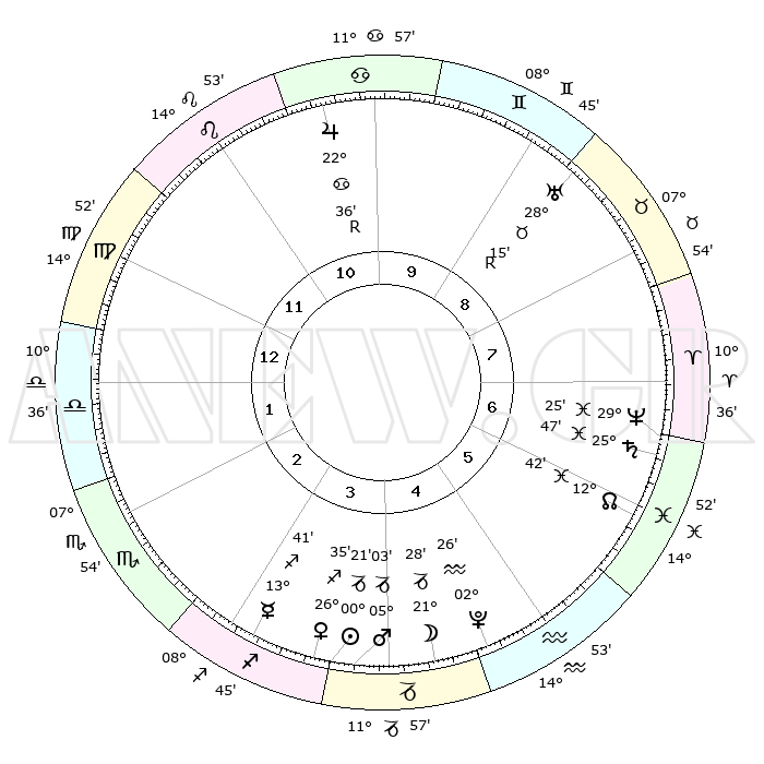 | | ΘΕΣΕΙΣ ΠΛΑΝΗΤΩΝ ΑΣΤΡΟΛΟΓΙΚΟΥ ΧΑΡΤΗ ΤΗΣ ΣΤΙΓΜΗΣ ΑΥΤΗΣ | | | | Πλανήτης | Ζώδιο | Μοίρες | Δεκαήμ. | Σε οίκο | Απόκλιση | | Ακμές των οίκων | | Ηλιος | Αιγόκερως | 00°16' | Πρώτο | 4 | 23 S 26 | | 1ος | 18°05' | Παρθένος | | Σελήνη | Αιγόκερως | 20°32' | Τρίτο | 5 | 25 S 44 | | 2ος | 13°43' | Ζυγός | | Ερμής | Τοξότης | 13°35' | Δεύτερο | 3 | 21 S 47 | | 3ος | 13°38' | Σκορπιός | | Αφροδίτη | Τοξότης | 26°30' | Τρίτο | 4 | 23 S 30 | | 4ος | 16°34' | Τοξότης | | Αρης | Αιγόκερως | 04°59' | Πρώτο | 4 | 24 S 10 | | 5ος | 19°49' | Αιγόκερως | | Δίας | Καρκίνος | 22°37'R | Τρίτο | 11 | 21 N 45 | | 6ος | 20°43' | Υδροχόος | | Κρόνος | Ιχθείς | 25°47' | Τρίτο | 7 | 03 S 47 | | 7ος | 18°05' | Ιχθείς | | Ουρανός | Ταύρος | 28°15'R | Τρίτο | 9 | 19 N 34 | | 8ος | 13°43' | Κριός | | Ποσειδώνας | Ιχθείς | 29°25' | Τρίτο | 7 | 01 S 28 | | 9ος | 13°38' | Ταύρος | | Πλούτωνας | Υδροχόος | 02°26' | Πρώτο | 5 | 23 S 17 | | 10ος | 16°34' | Δίδυμοι | | Β. Δεσμός | Ιχθείς | 12°42' | Δεύτερο | 6 | 06 S 47 | | 11ος | 19°49' | Καρκίνος | | Ωροσκόπος | Παρθένος | 18°05' | Δεύτερο | | | 12ος | 20°43' | Λέων | | Μεσουράνημα | Δίδυμοι | 16°34' | Δεύτερο | | | |