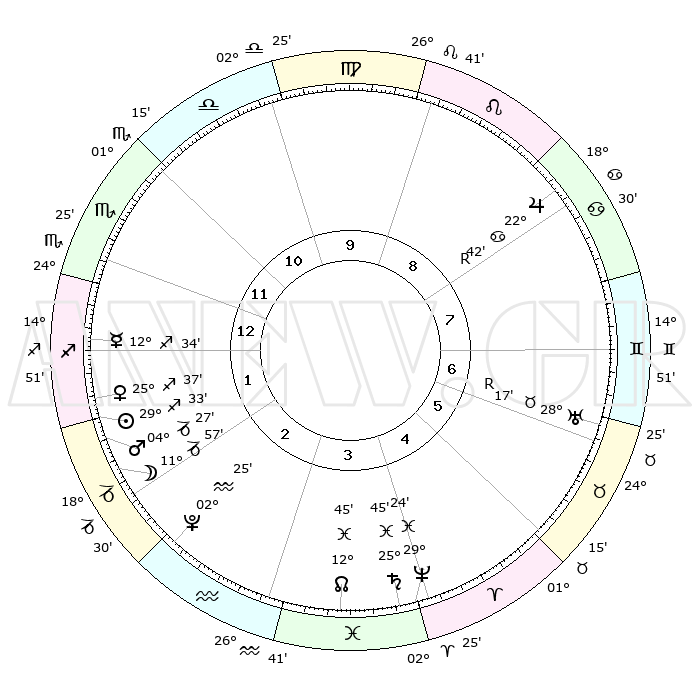 | | ΘΕΣΕΙΣ ΠΛΑΝΗΤΩΝ ΑΣΤΡΟΛΟΓΙΚΟΥ ΧΑΡΤΗ ΤΗΣ ΣΤΙΓΜΗΣ ΑΥΤΗΣ | | | | Πλανήτης | Ζώδιο | Μοίρες | Δεκαήμ. | Σε οίκο | Απόκλιση | | Ακμές των οίκων | | Ηλιος | Τοξότης | 29°29' | Τρίτο | 2 | 23 S 26 | | 1ος | 24°30' | Σκορπιός | | Σελήνη | Αιγόκερως | 11°07' | Δεύτερο | 2 | 27 S 19 | | 2ος | 24°56' | Τοξότης | | Ερμής | Τοξότης | 12°28' | Δεύτερο | 1 | 21 S 32 | | 3ος | 29°45' | Αιγόκερως | | Αφροδίτη | Τοξότης | 25°32' | Τρίτο | 2 | 23 S 26 | | 4ος | 05°36' | Ιχθείς | | Αρης | Αιγόκερως | 04°24' | Πρώτο | 2 | 24 S 11 | | 5ος | 07°15' | Κριός | | Δίας | Καρκίνος | 22°42'R | Τρίτο | 8 | 21 N 44 | | 6ος | 03°03' | Ταύρος | | Κρόνος | Ιχθείς | 25°45' | Τρίτο | 4 | 03 S 48 | | 7ος | 24°30' | Ταύρος | | Ουρανός | Ταύρος | 28°17'R | Τρίτο | 7 | 19 N 35 | | 8ος | 24°55' | Δίδυμοι | | Ποσειδώνας | Ιχθείς | 29°24' | Τρίτο | 4 | 01 S 28 | | 9ος | 29°45' | Καρκίνος | | Πλούτωνας | Υδροχόος | 02°24' | Πρώτο | 3 | 23 S 17 | | 10ος | 05°36' | Παρθένος | | Β. Δεσμός | Ιχθείς | 12°45' | Δεύτερο | 4 | 06 S 46 | | 11ος | 07°15' | Ζυγός | | Ωροσκόπος | Σκορπιός | 24°30' | Τρίτο | | | 12ος | 03°03' | Σκορπιός | | Μεσουράνημα | Παρθένος | 05°36' | Πρώτο | | | |
