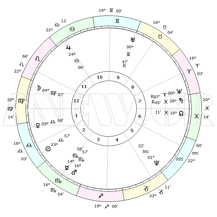 | ΘΕΣΕΙΣ ΠΛΑΝΗΤΩΝ ΑΣΤΡΟΛΟΓΙΚΟΥ ΧΑΡΤΗ ΤΗΣ ΣΤΙΓΜΗΣ ΑΥΤΗΣ | | Πλανήτης | Ζώδιο | Μοίρες | Δεκαήμ. | Σε οίκο | Απόκλιση | | Ακμές των οίκων | Ηλιος | Ζυγός | 23°31' | Τρίτο | 7 | 09 S 08 | | 1ος | 17°11' | Κριός | Σελήνη | Λέων | 28°36' | Τρίτο | 5 | 13 N 35 | | 2ος | 22°58' | Ταύρος | Ερμής | Σκορπιός | 14°20' | Δεύτερο | 7 | 17 S 57 | | 3ος | 17°59' | Δίδυμοι | Αφροδίτη | Ζυγός | 03°26' | Πρώτο | 6 | 00 N 02 | | 4ος | 09°45' | Καρκίνος | Αρης | Σκορπιός | 16°39' | Δεύτερο | 7 | 17 S 02 | | 5ος | 03°03' | Λέων | Δίας | Καρκίνος | 24°04' | Τρίτο | 4 | 21 N 21 | | 6ος | 03°20' | Παρθένος | Κρόνος | Ιχθείς | 26°47'R | Τρίτο | 12 | 03 S 34 | | 7ος | 17°11' | Ζυγός | Ουρανός | Δίδυμοι | 00°48'R | Πρώτο | 2 | 20 N 06 | | 8ος | 22°58' | Σκορπιός | Ποσειδώνας | Κριός | 00°08'R | Πρώτο | 12 | 01 S 12 | | 9ος | 17°59' | Τοξότης | Πλούτωνας | Υδροχόος | 01°22' | Πρώτο | 10 | 23 S 32 | | 10ος | 09°45' | Αιγόκερως | Β. Δεσμός | Ιχθείς | 16°13' | Δεύτερο | 12 | 05 S 26 | | 11ος | 03°03' | Υδροχόος | Ωροσκόπος | Κριός | 17°11' | Δεύτερο | | | 12ος | 03°20' | Ιχθείς | Μεσουράνημα | Αιγόκερως | 09°45' | Πρώτο | | | |