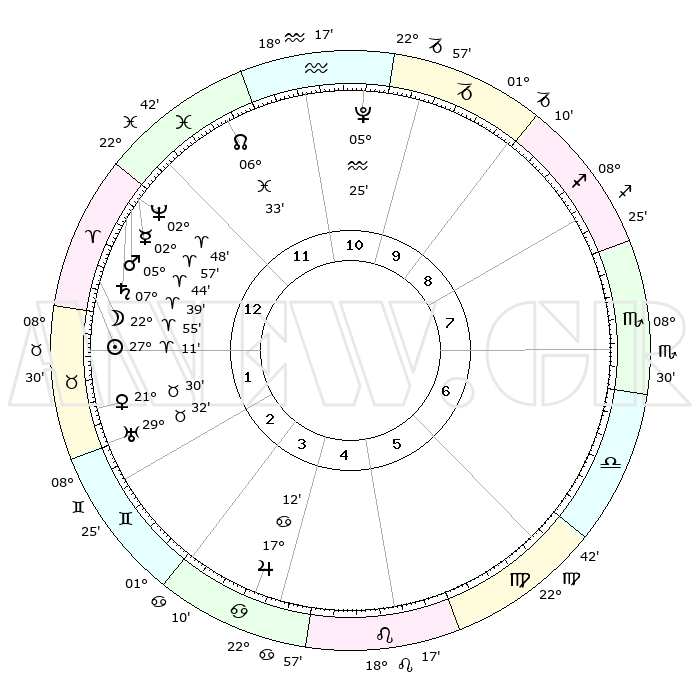 | | ΘΕΣΕΙΣ ΠΛΑΝΗΤΩΝ ΑΣΤΡΟΛΟΓΙΚΟΥ ΧΑΡΤΗ ΤΗΣ ΣΤΙΓΜΗΣ ΑΥΤΗΣ | | | | Πλανήτης | Ζώδιο | Μοίρες | Δεκαήμ. | Σε οίκο | Απόκλιση | | Ακμές των οίκων | | Ηλιος | Κριός | 27°08' | Τρίτο | 1 | 10 N 27 | | 1ος | 11°22' | Κριός | | Σελήνη | Κριός | 22°12' | Τρίτο | 1 | 11 N 57 | | 2ος | 18°44' | Ταύρος | | Ερμής | Κριός | 02°52' | Πρώτο | 12 | 01 S 16 | | 3ος | 14°30' | Δίδυμοι | | Αφροδίτη | Ταύρος | 21°26' | Τρίτο | 2 | 18 N 23 | | 4ος | 06°25' | Καρκίνος | | Αρης | Κριός | 05°42' | Πρώτο | 12 | 01 N 22 | | 5ος | 29°19' | Καρκίνος | | Δίας | Καρκίνος | 17°11' | Δεύτερο | 4 | 22 N 42 | | 6ος | 28°34' | Λέων | | Κρόνος | Κριός | 07°39' | Πρώτο | 12 | 01 N 03 | | 7ος | 11°22' | Ζυγός | | Ουρανός | Ταύρος | 29°32' | Τρίτο | 2 | 19 N 53 | | 8ος | 18°44' | Σκορπιός | | Ποσειδώνας | Κριός | 02°48' | Πρώτο | 12 | 00 S 06 | | 9ος | 14°30' | Τοξότης | | Πλούτωνας | Υδροχόος | 05°25' | Πρώτο | 11 | 22 S 47 | | 10ος | 06°25' | Αιγόκερως | | Β. Δεσμός | Ιχθείς | 06°33' | Πρώτο | 12 | 09 S 06 | | 11ος | 29°19' | Αιγόκερως | | Ωροσκόπος | Κριός | 11°22' | Δεύτερο | | | 12ος | 28°34' | Υδροχόος | | Μεσουράνημα | Αιγόκερως | 06°25' | Πρώτο | | | |