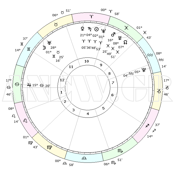 | | ΘΕΣΕΙΣ ΠΛΑΝΗΤΩΝ ΑΣΤΡΟΛΟΓΙΚΟΥ ΧΑΡΤΗ ΤΗΣ ΣΤΙΓΜΗΣ ΑΥΤΗΣ | | | | Πλανήτης | Ζώδιο | Μοίρες | Δεκαήμ. | Σε οίκο | Απόκλιση | | Ακμές των οίκων | | Ηλιος | Κριός | 02°45' | Πρώτο | 10 | 01 N 05 | | 1ος | 27°31' | Δίδυμοι | | Σελήνη | Δίδυμοι | 00°20' | Πρώτο | 12 | 25 N 16 | | 2ος | 18°28' | Καρκίνος | | Ερμής | Ιχθείς | 08°48' | Πρώτο | 10 | 07 S 55 | | 3ος | 10°07' | Λέων | | Αφροδίτη | Κριός | 21°00' | Τρίτο | 11 | 07 N 29 | | 4ος | 06°03' | Παρθένος | | Αρης | Ιχθείς | 16°22' | Δεύτερο | 10 | 06 S 22 | | 5ος | 09°35' | Ζυγός | | Δίας | Καρκίνος | 15°20' | Δεύτερο | 1 | 22 N 55 | | 6ος | 19°44' | Σκορπιός | | Κρόνος | Κριός | 04°35' | Πρώτο | 10 | 00 S 08 | | 7ος | 27°31' | Τοξότης | | Ουρανός | Ταύρος | 28°25' | Τρίτο | 12 | 19 N 38 | | 8ος | 18°28' | Αιγόκερως | | Ποσειδώνας | Κριός | 01°53' | Πρώτο | 10 | 00 S 27 | | 9ος | 10°07' | Υδροχόος | | Πλούτωνας | Υδροχόος | 05°04' | Πρώτο | 8 | 22 S 48 | | 10ος | 06°03' | Ιχθείς | | Β. Δεσμός | Ιχθείς | 07°52' | Πρώτο | 10 | 08 S 37 | | 11ος | 09°35' | Κριός | | Ωροσκόπος | Δίδυμοι | 27°31' | Τρίτο | | | 12ος | 19°44' | Ταύρος | | Μεσουράνημα | Ιχθείς | 06°03' | Πρώτο | | | |
