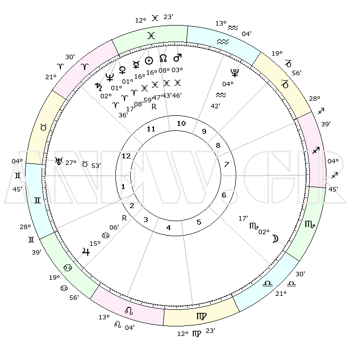 | | ΘΕΣΕΙΣ ΠΛΑΝΗΤΩΝ ΑΣΤΡΟΛΟΓΙΚΟΥ ΧΑΡΤΗ ΤΗΣ ΣΤΙΓΜΗΣ ΑΥΤΗΣ | | | | Πλανήτης | Ζώδιο | Μοίρες | Δεκαήμ. | Σε οίκο | Απόκλιση | | Ακμές των οίκων | | Ηλιος | Ιχθείς | 16°39' | Δεύτερο | 12 | 05 S 16 | | 1ος | 27°48' | Ιχθείς | | Σελήνη | Σκορπιός | 00°41' | Πρώτο | 7 | 15 S 35 | | 2ος | 08°37' | Ταύρος | | Ερμής | Ιχθείς | 17°07'R | Δεύτερο | 12 | 01 S 43 | | 3ος | 06°22' | Δίδυμοι | | Αφροδίτη | Κριός | 00°58' | Πρώτο | 1 | 00 S 45 | | 4ος | 28°46' | Δίδυμοι | | Αρης | Ιχθείς | 03°39' | Πρώτο | 12 | 11 S 11 | | 5ος | 20°59' | Καρκίνος | | Δίας | Καρκίνος | 15°07'R | Δεύτερο | 4 | 22 N 56 | | 6ος | 18°03' | Λέων | | Κρόνος | Κριός | 02°35' | Πρώτο | 1 | 00 S 55 | | 7ος | 27°48' | Παρθένος | | Ουρανός | Ταύρος | 27°53' | Τρίτο | 2 | 19 N 31 | | 8ος | 08°37' | Σκορπιός | | Ποσειδώνας | Κριός | 01°17' | Πρώτο | 1 | 00 S 41 | | 9ος | 06°22' | Τοξότης | | Πλούτωνας | Υδροχόος | 04°42' | Πρώτο | 11 | 22 S 51 | | 10ος | 28°46' | Τοξότης | | Β. Δεσμός | Ιχθείς | 08°43' | Πρώτο | 12 | 08 S 18 | | 11ος | 20°59' | Αιγόκερως | | Ωροσκόπος | Ιχθείς | 27°48' | Τρίτο | | | 12ος | 18°03' | Υδροχόος | | Μεσουράνημα | Τοξότης | 28°46' | Τρίτο | | | |