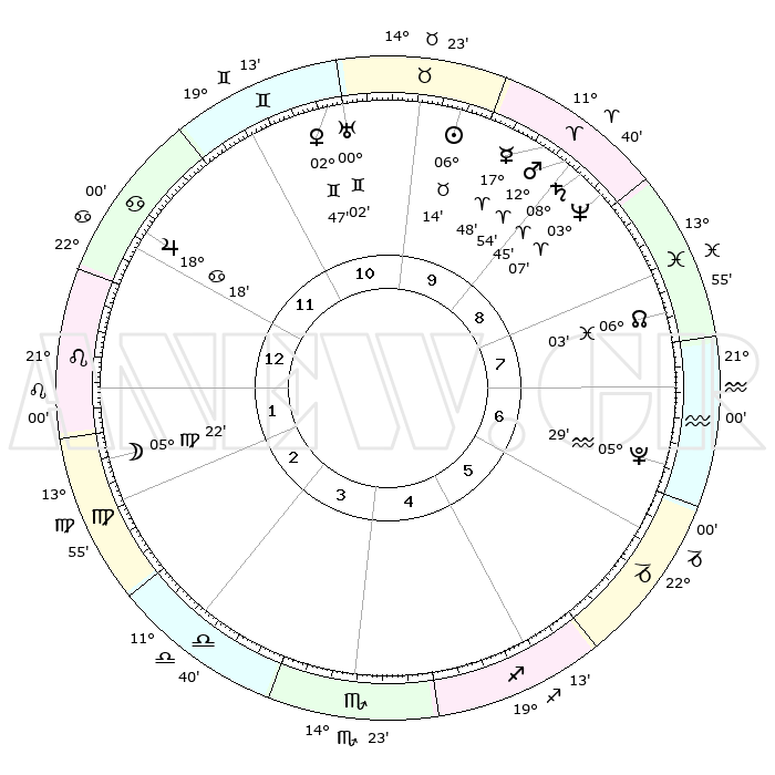 | | ΘΕΣΕΙΣ ΠΛΑΝΗΤΩΝ ΑΣΤΡΟΛΟΓΙΚΟΥ ΧΑΡΤΗ ΤΗΣ ΣΤΙΓΜΗΣ ΑΥΤΗΣ | | | | Πλανήτης | Ζώδιο | Μοίρες | Δεκαήμ. | Σε οίκο | Απόκλιση | | Ακμές των οίκων | | Ηλιος | Ταύρος | 06°10' | Πρώτο | 10 | 13 N 34 | | 1ος | 01°28' | Λέων | | Σελήνη | Παρθένος | 04°29' | Πρώτο | 2 | 10 N 06 | | 2ος | 22°37' | Λέων | | Ερμής | Κριός | 17°41' | Δεύτερο | 9 | 04 N 46 | | 3ος | 17°52' | Παρθένος | | Αφροδίτη | Δίδυμοι | 02°42' | Πρώτο | 11 | 21 N 23 | | 4ος | 19°05' | Ζυγός | | Αρης | Κριός | 12°51' | Δεύτερο | 9 | 04 N 14 | | 5ος | 25°05' | Σκορπιός | | Δίας | Καρκίνος | 18°18' | Δεύτερο | 12 | 22 N 34 | | 6ος | 00°33' | Αιγόκερως | | Κρόνος | Κριός | 08°44' | Πρώτο | 9 | 01 N 28 | | 7ος | 01°29' | Υδροχόος | | Ουρανός | Δίδυμοι | 00°01' | Πρώτο | 11 | 19 N 59 | | 8ος | 22°37' | Υδροχόος | | Ποσειδώνας | Κριός | 03°07' | Πρώτο | 9 | 00 N 02 | | 9ος | 17°52' | Ιχθείς | | Πλούτωνας | Υδροχόος | 05°29' | Πρώτο | 7 | 22 S 48 | | 10ος | 19°05' | Κριός | | Β. Δεσμός | Ιχθείς | 06°04' | Πρώτο | 8 | 09 S 17 | | 11ος | 25°05' | Ταύρος | | Ωροσκόπος | Λέων | 01°28' | Πρώτο | | | 12ος | 00°33' | Καρκίνος | | Μεσουράνημα | Κριός | 19°05' | Δεύτερο | | | |