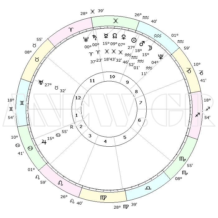 | | ΘΕΣΕΙΣ ΠΛΑΝΗΤΩΝ ΑΣΤΡΟΛΟΓΙΚΟΥ ΧΑΡΤΗ ΤΗΣ ΣΤΙΓΜΗΣ ΑΥΤΗΣ | | | | Πλανήτης | Ζώδιο | Μοίρες | Δεκαήμ. | Σε οίκο | Απόκλιση | | Ακμές των οίκων | | Ηλιος | Υδροχόος | 27°42' | Τρίτο | 10 | 12 S 16 | | 1ος | 20°60' | Ταύρος | | Σελήνη | Υδροχόος | 14°08' | Δεύτερο | 10 | 18 S 42 | | 2ος | 17°46' | Δίδυμοι | | Ερμής | Ιχθείς | 15°12' | Δεύτερο | 11 | 05 S 30 | | 3ος | 09°37' | Καρκίνος | | Αφροδίτη | Ιχθείς | 07°27' | Πρώτο | 11 | 10 S 08 | | 4ος | 01°50' | Λέων | | Αρης | Υδροχόος | 18°48' | Δεύτερο | 10 | 16 S 13 | | 5ος | 28°50' | Λέων | | Δίας | Καρκίνος | 15°55'R | Δεύτερο | 3 | 22 N 49 | | 6ος | 05°43' | Ζυγός | | Κρόνος | Κριός | 00°23' | Πρώτο | 11 | 01 S 49 | | 7ος | 20°60' | Σκορπιός | | Ουρανός | Ταύρος | 27°31' | Τρίτο | 1 | 19 N 25 | | 8ος | 17°46' | Τοξότης | | Ποσειδώνας | Κριός | 00°37' | Πρώτο | 11 | 00 S 57 | | 9ος | 09°37' | Αιγόκερως | | Πλούτωνας | Υδροχόος | 04°11' | Πρώτο | 10 | 22 S 56 | | 10ος | 01°50' | Υδροχόος | | Β. Δεσμός | Ιχθείς | 09°43' | Πρώτο | 11 | 07 S 56 | | 11ος | 28°50' | Υδροχόος | | Ωροσκόπος | Ταύρος | 20°60' | Τρίτο | | | 12ος | 05°43' | Κριός | | Μεσουράνημα | Υδροχόος | 01°50' | Πρώτο | | | |