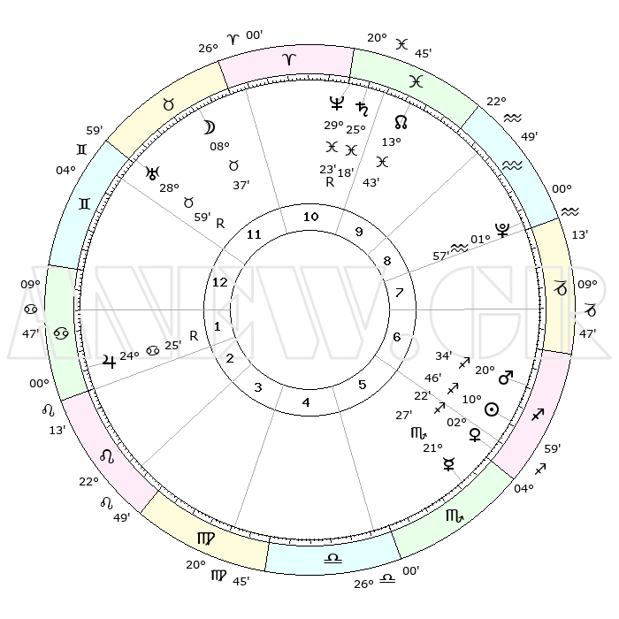 | | ΘΕΣΕΙΣ ΠΛΑΝΗΤΩΝ ΑΣΤΡΟΛΟΓΙΚΟΥ ΧΑΡΤΗ ΤΗΣ ΣΤΙΓΜΗΣ ΑΥΤΗΣ | | | | Πλανήτης | Ζώδιο | Μοίρες | Δεκαήμ. | Σε οίκο | Απόκλιση | | Ακμές των οίκων | | Ηλιος | Τοξότης | 10°45' | Δεύτερο | 6 | 22 S 03 | | 1ος | 00°53' | Καρκίνος | | Σελήνη | Ταύρος | 08°12' | Πρώτο | 11 | 18 N 05 | | 2ος | 21°37' | Καρκίνος | | Ερμής | Σκορπιός | 21°26' | Τρίτο | 5 | 15 S 35 | | 3ος | 13°29' | Λέων | | Αφροδίτη | Τοξότης | 02°20' | Πρώτο | 6 | 19 S 59 | | 4ος | 09°56' | Παρθένος | | Αρης | Τοξότης | 20°33' | Τρίτο | 6 | 23 S 46 | | 5ος | 14°01' | Ζυγός | | Δίας | Καρκίνος | 24°25'R | Τρίτο | 2 | 21 N 23 | | 6ος | 23°57' | Σκορπιός | | Κρόνος | Ιχθείς | 25°18' | Τρίτο | 10 | 04 S 02 | | 7ος | 00°53' | Αιγόκερως | | Ουρανός | Ταύρος | 28°59'R | Τρίτο | 12 | 19 N 44 | | 8ος | 21°37' | Αιγόκερως | | Ποσειδώνας | Ιχθείς | 29°23'R | Τρίτο | 10 | 01 S 29 | | 9ος | 13°29' | Υδροχόος | | Πλούτωνας | Υδροχόος | 01°57' | Πρώτο | 8 | 23 S 23 | | 10ος | 09°56' | Ιχθείς | | Β. Δεσμός | Ιχθείς | 13°43' | Δεύτερο | 10 | 06 S 24 | | 11ος | 14°01' | Κριός | | Ωροσκόπος | Καρκίνος | 00°53' | Πρώτο | | | 12ος | 23°57' | Ταύρος | | Μεσουράνημα | Ιχθείς | 09°56' | Πρώτο | | | |