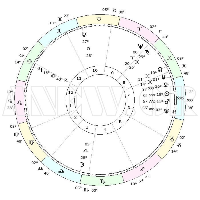 | | ΘΕΣΕΙΣ ΠΛΑΝΗΤΩΝ ΑΣΤΡΟΛΟΓΙΚΟΥ ΧΑΡΤΗ ΤΗΣ ΣΤΙΓΜΗΣ ΑΥΤΗΣ | | | | Πλανήτης | Ζώδιο | Μοίρες | Δεκαήμ. | Σε οίκο | Απόκλιση | | Ακμές των οίκων | | Ηλιος | Υδροχόος | 18°48' | Δεύτερο | 8 | 15 S 11 | | 1ος | 24°12' | Καρκίνος | | Σελήνη | Ζυγός | 27°16' | Τρίτο | 4 | 14 S 09 | | 2ος | 14°54' | Λέων | | Ερμής | Ιχθείς | 01°07' | Πρώτο | 8 | 12 S 15 | | 3ος | 09°11' | Παρθένος | | Αφροδίτη | Υδροχόος | 26°26' | Τρίτο | 8 | 14 S 03 | | 4ος | 09°25' | Ζυγός | | Αρης | Υδροχόος | 11°54' | Δεύτερο | 7 | 18 S 14 | | 5ος | 15°31' | Σκορπιός | | Δίας | Καρκίνος | 16°40'R | Δεύτερο | 12 | 22 N 42 | | 6ος | 22°12' | Τοξότης | | Κρόνος | Ιχθείς | 29°26' | Τρίτο | 9 | 02 S 13 | | 7ος | 24°12' | Αιγόκερως | | Ουρανός | Ταύρος | 27°28' | Τρίτο | 11 | 19 N 24 | | 8ος | 14°54' | Υδροχόος | | Ποσειδώνας | Κριός | 00°20' | Πρώτο | 9 | 01 S 04 | | 9ος | 09°11' | Ιχθείς | | Πλούτωνας | Υδροχόος | 03°54' | Πρώτο | 7 | 22 S 59 | | 10ος | 09°25' | Κριός | | Β. Δεσμός | Ιχθείς | 10°11' | Δεύτερο | 9 | 07 S 45 | | 11ος | 15°31' | Ταύρος | | Ωροσκόπος | Καρκίνος | 24°12' | Τρίτο | | | 12ος | 22°12' | Δίδυμοι | | Μεσουράνημα | Κριός | 09°25' | Πρώτο | | | |