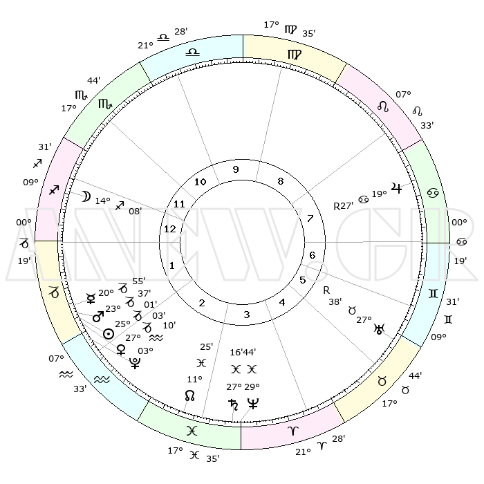 | | ΘΕΣΕΙΣ ΠΛΑΝΗΤΩΝ ΑΣΤΡΟΛΟΓΙΚΟΥ ΧΑΡΤΗ ΤΗΣ ΣΤΙΓΜΗΣ ΑΥΤΗΣ | | | | Πλανήτης | Ζώδιο | Μοίρες | Δεκαήμ. | Σε οίκο | Απόκλιση | | Ακμές των οίκων | | Ηλιος | Αιγόκερως | 24°52' | Τρίτο | 3 | 21 S 09 | | 1ος | 18°07' | Σκορπιός | | Σελήνη | Τοξότης | 12°28' | Δεύτερο | 1 | 27 S 22 | | 2ος | 17°52' | Τοξότης | | Ερμής | Αιγόκερως | 20°42' | Τρίτο | 2 | 23 S 36 | | 3ος | 21°46' | Αιγόκερως | | Αφροδίτη | Αιγόκερως | 26°52' | Τρίτο | 3 | 21 S 44 | | 4ος | 27°15' | Υδροχόος | | Αρης | Αιγόκερως | 23°31' | Τρίτο | 3 | 22 S 21 | | 5ος | 29°28' | Ιχθείς | | Δίας | Καρκίνος | 19°28'R | Δεύτερο | 8 | 22 N 17 | | 6ος | 26°06' | Κριός | | Κρόνος | Ιχθείς | 27°15' | Τρίτο | 4 | 03 S 08 | | 7ος | 18°07' | Ταύρος | | Ουρανός | Ταύρος | 27°38'R | Τρίτο | 7 | 19 N 26 | | 8ος | 17°52' | Δίδυμοι | | Ποσειδώνας | Ιχθείς | 29°44' | Τρίτο | 5 | 01 S 19 | | 9ος | 21°46' | Καρκίνος | | Πλούτωνας | Υδροχόος | 03°10' | Πρώτο | 3 | 23 S 08 | | 10ος | 27°15' | Λέων | | Β. Δεσμός | Ιχθείς | 11°26' | Δεύτερο | 4 | 07 S 17 | | 11ος | 29°28' | Παρθένος | | Ωροσκόπος | Σκορπιός | 18°07' | Δεύτερο | | | 12ος | 26°06' | Ζυγός | | Μεσουράνημα | Λέων | 27°15' | Τρίτο | | | |