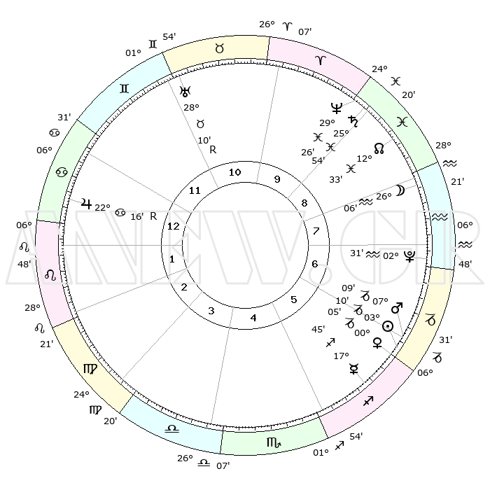 | | ΘΕΣΕΙΣ ΠΛΑΝΗΤΩΝ ΑΣΤΡΟΛΟΓΙΚΟΥ ΧΑΡΤΗ ΤΗΣ ΣΤΙΓΜΗΣ ΑΥΤΗΣ | | | | Πλανήτης | Ζώδιο | Μοίρες | Δεκαήμ. | Σε οίκο | Απόκλιση | | Ακμές των οίκων | | Ηλιος | Αιγόκερως | 03°06' | Πρώτο | 6 | 23 S 24 | | 1ος | 15°40' | Καρκίνος | | Σελήνη | Υδροχόος | 25°11' | Τρίτο | 8 | 14 S 27 | | 2ος | 06°07' | Λέων | | Ερμής | Τοξότης | 17°39' | Δεύτερο | 6 | 22 S 34 | | 3ος | 29°20' | Λέων | | Αφροδίτη | Τοξότης | 29°60' | Τρίτο | 6 | 23 S 39 | | 4ος | 28°15' | Παρθένος | | Αρης | Αιγόκερως | 07°06' | Πρώτο | 6 | 24 S 05 | | 5ος | 04°01' | Σκορπιός | | Δίας | Καρκίνος | 22°17'R | Τρίτο | 1 | 21 N 49 | | 6ος | 12°07' | Τοξότης | | Κρόνος | Ιχθείς | 25°54' | Τρίτο | 9 | 03 S 44 | | 7ος | 15°40' | Αιγόκερως | | Ουρανός | Ταύρος | 28°10'R | Τρίτο | 11 | 19 N 33 | | 8ος | 06°07' | Υδροχόος | | Ποσειδώνας | Ιχθείς | 29°26' | Τρίτο | 10 | 01 S 27 | | 9ος | 29°20' | Υδροχόος | | Πλούτωνας | Υδροχόος | 02°30' | Πρώτο | 7 | 23 S 16 | | 10ος | 28°15' | Ιχθείς | | Β. Δεσμός | Ιχθείς | 12°33' | Δεύτερο | 9 | 06 S 51 | | 11ος | 04°01' | Ταύρος | | Ωροσκόπος | Καρκίνος | 15°40' | Δεύτερο | | | 12ος | 12°07' | Δίδυμοι | | Μεσουράνημα | Ιχθείς | 28°15' | Τρίτο | | | |