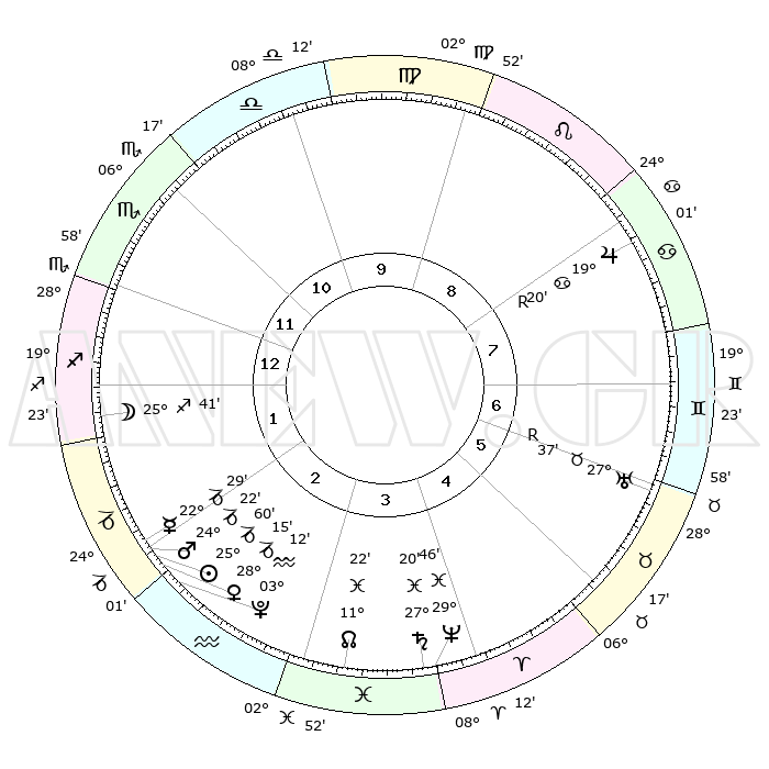 | | ΘΕΣΕΙΣ ΠΛΑΝΗΤΩΝ ΑΣΤΡΟΛΟΓΙΚΟΥ ΧΑΡΤΗ ΤΗΣ ΣΤΙΓΜΗΣ ΑΥΤΗΣ | | | | Πλανήτης | Ζώδιο | Μοίρες | Δεκαήμ. | Σε οίκο | Απόκλιση | | Ακμές των οίκων | | Ηλιος | Αιγόκερως | 25°56' | Τρίτο | 2 | 20 S 57 | | 1ος | 01°38' | Τοξότης | | Σελήνη | Τοξότης | 24°58' | Τρίτο | 1 | 28 S 17 | | 2ος | 02°60' | Αιγόκερως | | Ερμής | Αιγόκερως | 22°23' | Τρίτο | 2 | 23 S 24 | | 3ος | 08°58' | Υδροχόος | | Αφροδίτη | Αιγόκερως | 28°11' | Τρίτο | 2 | 21 S 31 | | 4ος | 15°03' | Ιχθείς | | Αρης | Αιγόκερως | 24°19' | Τρίτο | 2 | 22 S 12 | | 5ος | 15°52' | Κριός | | Δίας | Καρκίνος | 19°20'R | Δεύτερο | 8 | 22 N 19 | | 6ος | 10°42' | Ταύρος | | Κρόνος | Ιχθείς | 27°20' | Τρίτο | 4 | 03 S 06 | | 7ος | 01°38' | Δίδυμοι | | Ουρανός | Ταύρος | 27°37'R | Τρίτο | 6 | 19 N 26 | | 8ος | 02°60' | Καρκίνος | | Ποσειδώνας | Ιχθείς | 29°45' | Τρίτο | 4 | 01 S 19 | | 9ος | 08°58' | Λέων | | Πλούτωνας | Υδροχόος | 03°12' | Πρώτο | 2 | 23 S 07 | | 10ος | 15°03' | Παρθένος | | Β. Δεσμός | Ιχθείς | 11°22' | Δεύτερο | 3 | 07 S 18 | | 11ος | 15°52' | Ζυγός | | Ωροσκόπος | Τοξότης | 01°38' | Πρώτο | | | 12ος | 10°42' | Σκορπιός | | Μεσουράνημα | Παρθένος | 15°03' | Δεύτερο | | | |