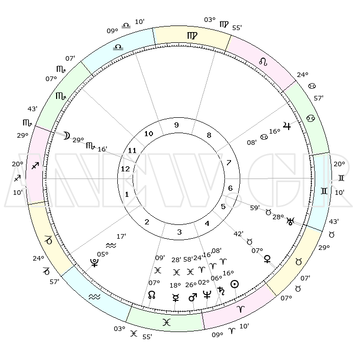 | | ΘΕΣΕΙΣ ΠΛΑΝΗΤΩΝ ΑΣΤΡΟΛΟΓΙΚΟΥ ΧΑΡΤΗ ΤΗΣ ΣΤΙΓΜΗΣ ΑΥΤΗΣ | | | | Πλανήτης | Ζώδιο | Μοίρες | Δεκαήμ. | Σε οίκο | Απόκλιση | | Ακμές των οίκων | | Ηλιος | Κριός | 16°04' | Δεύτερο | 5 | 06 N 19 | | 1ος | 00°07' | Τοξότης | | Σελήνη | Σκορπιός | 28°28' | Τρίτο | 12 | 24 S 46 | | 2ος | 01°16' | Αιγόκερως | | Ερμής | Ιχθείς | 18°24' | Δεύτερο | 4 | 06 S 23 | | 3ος | 06°59' | Υδροχόος | | Αφροδίτη | Ταύρος | 07°37' | Πρώτο | 5 | 13 N 49 | | 4ος | 13°02' | Ιχθείς | | Αρης | Ιχθείς | 26°55' | Τρίτο | 4 | 02 S 10 | | 5ος | 14°03' | Κριός | | Δίας | Καρκίνος | 16°08' | Δεύτερο | 8 | 22 N 50 | | 6ος | 09°05' | Ταύρος | | Κρόνος | Κριός | 06°16' | Πρώτο | 4 | 00 N 32 | | 7ος | 00°07' | Δίδυμοι | | Ουρανός | Ταύρος | 28°59' | Τρίτο | 6 | 19 N 46 | | 8ος | 01°16' | Καρκίνος | | Ποσειδώνας | Κριός | 02°23' | Πρώτο | 4 | 00 S 15 | | 9ος | 06°59' | Λέων | | Πλούτωνας | Υδροχόος | 05°17' | Πρώτο | 2 | 22 S 47 | | 10ος | 13°02' | Παρθένος | | Β. Δεσμός | Ιχθείς | 07°09' | Πρώτο | 3 | 08 S 53 | | 11ος | 14°03' | Ζυγός | | Ωροσκόπος | Τοξότης | 00°07' | Πρώτο | | | 12ος | 09°05' | Σκορπιός | | Μεσουράνημα | Παρθένος | 13°02' | Δεύτερο | | | |