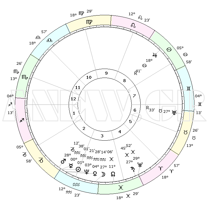 | | ΘΕΣΕΙΣ ΠΛΑΝΗΤΩΝ ΑΣΤΡΟΛΟΓΙΚΟΥ ΧΑΡΤΗ ΤΗΣ ΣΤΙΓΜΗΣ ΑΥΤΗΣ | | | | Πλανήτης | Ζώδιο | Μοίρες | Δεκαήμ. | Σε οίκο | Απόκλιση | | Ακμές των οίκων | | Ηλιος | Υδροχόος | 00°56' | Πρώτο | 3 | 19 S 57 | | 1ος | 11°36' | Σκορπιός | | Σελήνη | Υδροχόος | 26°14' | Τρίτο | 4 | 13 S 53 | | 2ος | 10°48' | Τοξότης | | Ερμής | Υδροχόος | 00°31' | Πρώτο | 3 | 22 S 02 | | 3ος | 13°52' | Αιγόκερως | | Αφροδίτη | Υδροχόος | 04°22' | Πρώτο | 3 | 20 S 16 | | 4ος | 18°54' | Υδροχόος | | Αρης | Αιγόκερως | 28°09' | Τρίτο | 3 | 21 S 30 | | 5ος | 21°30' | Ιχθείς | | Δίας | Καρκίνος | 18°41'R | Δεύτερο | 9 | 22 N 25 | | 6ος | 18°57' | Κριός | | Κρόνος | Ιχθείς | 27°44' | Τρίτο | 5 | 02 S 55 | | 7ος | 11°36' | Ταύρος | | Ουρανός | Ταύρος | 27°33'R | Τρίτο | 7 | 19 N 25 | | 8ος | 10°48' | Δίδυμοι | | Ποσειδώνας | Ιχθείς | 29°52' | Τρίτο | 5 | 01 S 16 | | 9ος | 13°52' | Καρκίνος | | Πλούτωνας | Υδροχόος | 03°21' | Πρώτο | 3 | 23 S 05 | | 10ος | 18°54' | Λέων | | Β. Δεσμός | Ιχθείς | 11°07' | Δεύτερο | 4 | 07 S 24 | | 11ος | 21°30' | Παρθένος | | Ωροσκόπος | Σκορπιός | 11°36' | Δεύτερο | | | 12ος | 18°57' | Ζυγός | | Μεσουράνημα | Λέων | 18°54' | Δεύτερο | | | |
