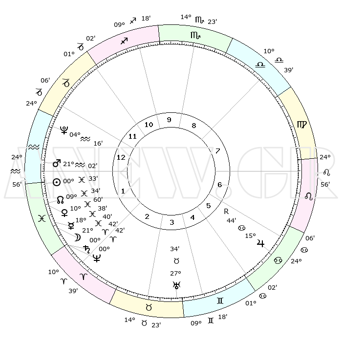 | | ΘΕΣΕΙΣ ΠΛΑΝΗΤΩΝ ΑΣΤΡΟΛΟΓΙΚΟΥ ΧΑΡΤΗ ΤΗΣ ΣΤΙΓΜΗΣ ΑΥΤΗΣ | | | | Πλανήτης | Ζώδιο | Μοίρες | Δεκαήμ. | Σε οίκο | Απόκλιση | | Ακμές των οίκων | | Ηλιος | Ιχθείς | 00°28' | Πρώτο | 2 | 11 S 18 | | 1ος | 17°10' | Αιγόκερως | | Σελήνη | Ιχθείς | 20°31' | Τρίτο | 2 | 02 S 47 | | 2ος | 28°39' | Υδροχόος | | Ερμής | Ιχθείς | 18°33' | Δεύτερο | 2 | 03 S 35 | | 3ος | 08°37' | Κριός | | Αφροδίτη | Ιχθείς | 10°54' | Δεύτερο | 2 | 08 S 50 | | 4ος | 09°26' | Ταύρος | | Αρης | Υδροχόος | 20°58' | Τρίτο | 1 | 15 S 32 | | 5ος | 03°23' | Δίδυμοι | | Δίας | Καρκίνος | 15°44'R | Δεύτερο | 6 | 22 N 50 | | 6ος | 24°36' | Δίδυμοι | | Κρόνος | Κριός | 00°41' | Πρώτο | 2 | 01 S 42 | | 7ος | 17°10' | Καρκίνος | | Ουρανός | Ταύρος | 27°34' | Τρίτο | 4 | 19 N 26 | | 8ος | 28°39' | Λέων | | Ποσειδώνας | Κριός | 00°42' | Πρώτο | 2 | 00 S 55 | | 9ος | 08°37' | Ζυγός | | Πλούτωνας | Υδροχόος | 04°15' | Πρώτο | 1 | 22 S 55 | | 10ος | 09°26' | Σκορπιός | | Β. Δεσμός | Ιχθείς | 09°34' | Πρώτο | 2 | 07 S 59 | | 11ος | 03°23' | Τοξότης | | Ωροσκόπος | Αιγόκερως | 17°10' | Δεύτερο | | | 12ος | 24°36' | Τοξότης | | Μεσουράνημα | Σκορπιός | 09°26' | Πρώτο | | | |