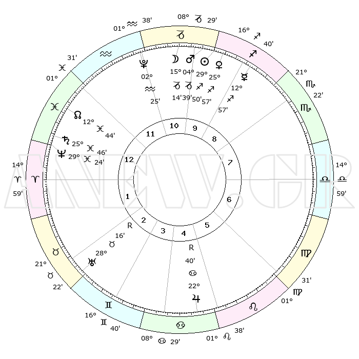 | | ΘΕΣΕΙΣ ΠΛΑΝΗΤΩΝ ΑΣΤΡΟΛΟΓΙΚΟΥ ΧΑΡΤΗ ΤΗΣ ΣΤΙΓΜΗΣ ΑΥΤΗΣ | | | | Πλανήτης | Ζώδιο | Μοίρες | Δεκαήμ. | Σε οίκο | Απόκλιση | | Ακμές των οίκων | | Ηλιος | Τοξότης | 29°45' | Τρίτο | 10 | 23 S 26 | | 1ος | 03°54' | Ιχθείς | | Σελήνη | Αιγόκερως | 14°22' | Δεύτερο | 11 | 26 S 51 | | 2ος | 18°58' | Κριός | | Ερμής | Τοξότης | 12°51' | Δεύτερο | 9 | 21 S 37 | | 3ος | 20°55' | Ταύρος | | Αφροδίτη | Τοξότης | 25°52' | Τρίτο | 10 | 23 S 28 | | 4ος | 14°57' | Δίδυμοι | | Αρης | Αιγόκερως | 04°36' | Πρώτο | 10 | 24 S 10 | | 5ος | 06°38' | Καρκίνος | | Δίας | Καρκίνος | 22°40'R | Τρίτο | 5 | 21 N 44 | | 6ος | 00°36' | Λέων | | Κρόνος | Ιχθείς | 25°46' | Τρίτο | 1 | 03 S 48 | | 7ος | 03°54' | Παρθένος | | Ουρανός | Ταύρος | 28°16'R | Τρίτο | 3 | 19 N 34 | | 8ος | 18°58' | Ζυγός | | Ποσειδώνας | Ιχθείς | 29°24' | Τρίτο | 1 | 01 S 28 | | 9ος | 20°55' | Σκορπιός | | Πλούτωνας | Υδροχόος | 02°25' | Πρώτο | 12 | 23 S 17 | | 10ος | 14°57' | Τοξότης | | Β. Δεσμός | Ιχθείς | 12°44' | Δεύτερο | 1 | 06 S 47 | | 11ος | 06°38' | Αιγόκερως | | Ωροσκόπος | Ιχθείς | 03°54' | Πρώτο | | | 12ος | 00°36' | Υδροχόος | | Μεσουράνημα | Τοξότης | 14°57' | Δεύτερο | | | |