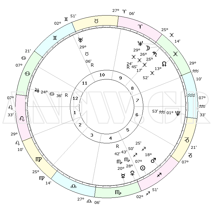 | | ΘΕΣΕΙΣ ΠΛΑΝΗΤΩΝ ΑΣΤΡΟΛΟΓΙΚΟΥ ΧΑΡΤΗ ΤΗΣ ΣΤΙΓΜΗΣ ΑΥΤΗΣ | | | | Πλανήτης | Ζώδιο | Μοίρες | Δεκαήμ. | Σε οίκο | Απόκλιση | | Ακμές των οίκων | | Ηλιος | Τοξότης | 07°49' | Πρώτο | 5 | 21 S 36 | | 1ος | 29°52' | Καρκίνος | | Σελήνη | Ιχθείς | 26°23' | Τρίτο | 9 | 00 S 28 | | 2ος | 20°54' | Λέων | | Ερμής | Σκορπιός | 20°42'R | Τρίτο | 4 | 15 S 28 | | 3ος | 15°56' | Παρθένος | | Αφροδίτη | Σκορπιός | 28°41' | Τρίτο | 5 | 19 S 08 | | 4ος | 16°57' | Ζυγός | | Αρης | Τοξότης | 18°24' | Δεύτερο | 5 | 23 S 35 | | 5ος | 22°60' | Σκορπιός | | Δίας | Καρκίνος | 24°36'R | Τρίτο | 12 | 21 N 21 | | 6ος | 28°43' | Τοξότης | | Κρόνος | Ιχθείς | 25°17' | Τρίτο | 9 | 04 S 03 | | 7ος | 29°52' | Αιγόκερως | | Ουρανός | Ταύρος | 29°06'R | Τρίτο | 11 | 19 N 45 | | 8ος | 20°54' | Υδροχόος | | Ποσειδώνας | Ιχθείς | 29°24'R | Τρίτο | 9 | 01 S 29 | | 9ος | 15°56' | Ιχθείς | | Πλούτωνας | Υδροχόος | 01°53' | Πρώτο | 7 | 23 S 24 | | 10ος | 16°57' | Κριός | | Β. Δεσμός | Ιχθείς | 13°53' | Δεύτερο | 8 | 06 S 20 | | 11ος | 22°60' | Ταύρος | | Ωροσκόπος | Καρκίνος | 29°52' | Τρίτο | | | 12ος | 28°43' | Δίδυμοι | | Μεσουράνημα | Κριός | 16°57' | Δεύτερο | | | |