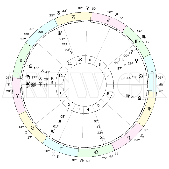 | ΘΕΣΕΙΣ ΠΛΑΝΗΤΩΝ ΑΣΤΡΟΛΟΓΙΚΟΥ ΧΑΡΤΗ ΤΗΣ ΣΤΙΓΜΗΣ ΑΥΤΗΣ | | Πλανήτης | Ζώδιο | Μοίρες | Δεκαήμ. | Σε οίκο | Απόκλιση | | Ακμές των οίκων | Ηλιος | Ζυγός | 13°33' | Δεύτερο | 8 | 05 S 21 | | 1ος | 17°37' | Υδροχόος | Σελήνη | Κριός | 05°20' | Πρώτο | 2 | 03 N 32 | | 2ος | 03°24' | Κριός | Ερμής | Ζυγός | 29°49' | Τρίτο | 8 | 12 S 07 | | 3ος | 08°36' | Ταύρος | Αφροδίτη | Παρθένος | 20°57' | Τρίτο | 7 | 04 N 53 | | 4ος | 04°24' | Δίδυμοι | Αρης | Σκορπιός | 09°41' | Πρώτο | 9 | 14 S 50 | | 5ος | 26°17' | Δίδυμοι | Δίας | Καρκίνος | 23°06' | Τρίτο | 6 | 21 N 29 | | 6ος | 18°43' | Καρκίνος | Κρόνος | Ιχθείς | 27°28'R | Τρίτο | 1 | 03 S 18 | | 7ος | 17°37' | Λέων | Ουρανός | Δίδυμοι | 01°05'R | Πρώτο | 3 | 20 N 10 | | 8ος | 03°24' | Ζυγός | Ποσειδώνας | Κριός | 00°24'R | Πρώτο | 1 | 01 S 06 | | 9ος | 08°36' | Σκορπιός | Πλούτωνας | Υδροχόος | 01°23'R | Πρώτο | 12 | 23 S 32 | | 10ος | 04°24' | Τοξότης | Β. Δεσμός | Ιχθείς | 16°45' | Δεύτερο | 1 | 05 S 14 | | 11ος | 26°17' | Τοξότης | Ωροσκόπος | Υδροχόος | 17°37' | Δεύτερο | | | 12ος | 18°43' | Αιγόκερως | Μεσουράνημα | Τοξότης | 04°24' | Πρώτο | | | |