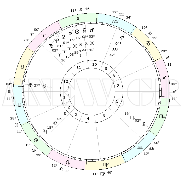 | | ΘΕΣΕΙΣ ΠΛΑΝΗΤΩΝ ΑΣΤΡΟΛΟΓΙΚΟΥ ΧΑΡΤΗ ΤΗΣ ΣΤΙΓΜΗΣ ΑΥΤΗΣ | | | | Πλανήτης | Ζώδιο | Μοίρες | Δεκαήμ. | Σε οίκο | Απόκλιση | | Ακμές των οίκων | | Ηλιος | Ιχθείς | 16°43' | Δεύτερο | 11 | 05 S 15 | | 1ος | 04°51' | Ταύρος | | Σελήνη | Σκορπιός | 01°29' | Πρώτο | 6 | 15 S 55 | | 2ος | 05°44' | Δίδυμοι | | Ερμής | Ιχθείς | 17°03'R | Δεύτερο | 11 | 01 S 45 | | 3ος | 28°49' | Δίδυμοι | | Αφροδίτη | Κριός | 01°03' | Πρώτο | 12 | 00 S 43 | | 4ος | 20°33' | Καρκίνος | | Αρης | Ιχθείς | 03°42' | Πρώτο | 11 | 11 S 10 | | 5ος | 15°27' | Λέων | | Δίας | Καρκίνος | 15°07'R | Δεύτερο | 3 | 22 N 56 | | 6ος | 19°08' | Παρθένος | | Κρόνος | Κριός | 02°36' | Πρώτο | 12 | 00 S 55 | | 7ος | 04°51' | Σκορπιός | | Ουρανός | Ταύρος | 27°53' | Τρίτο | 1 | 19 N 31 | | 8ος | 05°44' | Τοξότης | | Ποσειδώνας | Κριός | 01°17' | Πρώτο | 12 | 00 S 41 | | 9ος | 28°49' | Τοξότης | | Πλούτωνας | Υδροχόος | 04°42' | Πρώτο | 10 | 22 S 51 | | 10ος | 20°33' | Αιγόκερως | | Β. Δεσμός | Ιχθείς | 08°43' | Πρώτο | 11 | 08 S 18 | | 11ος | 15°27' | Υδροχόος | | Ωροσκόπος | Ταύρος | 04°51' | Πρώτο | | | 12ος | 19°08' | Ιχθείς | | Μεσουράνημα | Αιγόκερως | 20°33' | Τρίτο | | | |