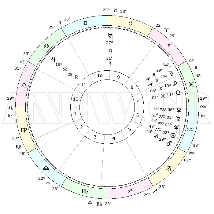 | | ΘΕΣΕΙΣ ΠΛΑΝΗΤΩΝ ΑΣΤΡΟΛΟΓΙΚΟΥ ΧΑΡΤΗ ΤΗΣ ΣΤΙΓΜΗΣ ΑΥΤΗΣ | | | | Πλανήτης | Ζώδιο | Μοίρες | Δεκαήμ. | Σε οίκο | Απόκλιση | | Ακμές των οίκων | | Ηλιος | Υδροχόος | 02°38' | Πρώτο | 6 | 19 S 34 | | 1ος | 06°00' | Λέων | | Σελήνη | Ιχθείς | 18°01' | Δεύτερο | 8 | 04 S 01 | | 2ος | 27°29' | Λέων | | Ερμής | Υδροχόος | 03°19' | Πρώτο | 6 | 21 S 26 | | 3ος | 23°21' | Παρθένος | | Αφροδίτη | Υδροχόος | 06°28' | Πρώτο | 7 | 19 S 48 | | 4ος | 25°04' | Ζυγός | | Αρης | Αιγόκερως | 29°27' | Τρίτο | 6 | 21 S 15 | | 5ος | 00°53' | Τοξότης | | Δίας | Καρκίνος | 18°28'R | Δεύτερο | 12 | 22 N 27 | | 6ος | 05°38' | Αιγόκερως | | Κρόνος | Ιχθείς | 27°53' | Τρίτο | 9 | 02 S 51 | | 7ος | 06°00' | Υδροχόος | | Ουρανός | Ταύρος | 27°31'R | Τρίτο | 10 | 19 N 25 | | 8ος | 27°29' | Υδροχόος | | Ποσειδώνας | Ιχθείς | 29°54' | Τρίτο | 9 | 01 S 15 | | 9ος | 23°21' | Ιχθείς | | Πλούτωνας | Υδροχόος | 03°24' | Πρώτο | 6 | 23 S 05 | | 10ος | 25°04' | Κριός | | Β. Δεσμός | Ιχθείς | 11°01' | Δεύτερο | 8 | 07 S 26 | | 11ος | 00°53' | Δίδυμοι | | Ωροσκόπος | Λέων | 06°00' | Πρώτο | | | 12ος | 05°38' | Καρκίνος | | Μεσουράνημα | Κριός | 25°04' | Τρίτο | | | |