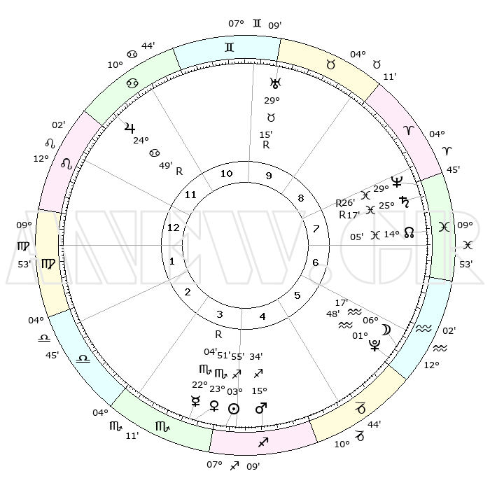 | | ΘΕΣΕΙΣ ΠΛΑΝΗΤΩΝ ΑΣΤΡΟΛΟΓΙΚΟΥ ΧΑΡΤΗ ΤΗΣ ΣΤΙΓΜΗΣ ΑΥΤΗΣ | | | | Πλανήτης | Ζώδιο | Μοίρες | Δεκαήμ. | Σε οίκο | Απόκλιση | | Ακμές των οίκων | | Ηλιος | Τοξότης | 03°49' | Πρώτο | 4 | 20 S 54 | | 1ος | 12°50' | Λέων | | Σελήνη | Υδροχόος | 05°07' | Πρώτο | 6 | 22 S 04 | | 2ος | 04°56' | Παρθένος | | Ερμής | Σκορπιός | 22°08'R | Τρίτο | 4 | 16 S 18 | | 3ος | 01°42' | Ζυγός | | Αφροδίτη | Σκορπιός | 23°44' | Τρίτο | 4 | 17 S 51 | | 4ος | 03°59' | Σκορπιός | | Αρης | Τοξότης | 15°29' | Δεύτερο | 5 | 23 S 16 | | 5ος | 09°24' | Τοξότης | | Δίας | Καρκίνος | 24°49'R | Τρίτο | 12 | 21 N 18 | | 6ος | 13°10' | Αιγόκερως | | Κρόνος | Ιχθείς | 25°17'R | Τρίτο | 8 | 04 S 04 | | 7ος | 12°50' | Υδροχόος | | Ουρανός | Ταύρος | 29°16'R | Τρίτο | 10 | 19 N 47 | | 8ος | 04°56' | Ιχθείς | | Ποσειδώνας | Ιχθείς | 29°26'R | Τρίτο | 8 | 01 S 28 | | 9ος | 01°42' | Κριός | | Πλούτωνας | Υδροχόος | 01°48' | Πρώτο | 6 | 23 S 26 | | 10ος | 03°59' | Ταύρος | | Β. Δεσμός | Ιχθείς | 14°05' | Δεύτερο | 8 | 06 S 16 | | 11ος | 09°24' | Δίδυμοι | | Ωροσκόπος | Λέων | 12°50' | Δεύτερο | | | 12ος | 13°10' | Καρκίνος | | Μεσουράνημα | Ταύρος | 03°59' | Πρώτο | | | |