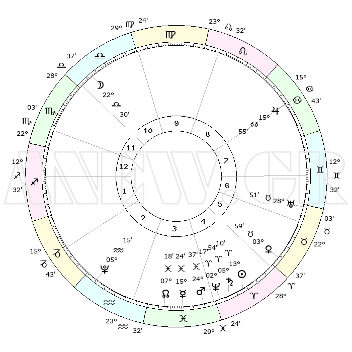 | | ΘΕΣΕΙΣ ΠΛΑΝΗΤΩΝ ΑΣΤΡΟΛΟΓΙΚΟΥ ΧΑΡΤΗ ΤΗΣ ΣΤΙΓΜΗΣ ΑΥΤΗΣ | | | | Πλανήτης | Ζώδιο | Μοίρες | Δεκαήμ. | Σε οίκο | Απόκλιση | | Ακμές των οίκων | | Ηλιος | Κριός | 13°06' | Δεύτερο | 5 | 05 N 10 | | 1ος | 25°06' | Σκορπιός | | Σελήνη | Ζυγός | 21°46' | Τρίτο | 11 | 11 S 46 | | 2ος | 25°36' | Τοξότης | | Ερμής | Ιχθείς | 15°21' | Δεύτερο | 4 | 07 S 14 | | 3ος | 00°31' | Υδροχόος | | Αφροδίτη | Ταύρος | 03°55' | Πρώτο | 6 | 12 N 29 | | 4ος | 06°23' | Ιχθείς | | Αρης | Ιχθείς | 24°34' | Τρίτο | 4 | 03 S 07 | | 5ος | 07°59' | Κριός | | Δίας | Καρκίνος | 15°54' | Δεύτερο | 8 | 22 N 51 | | 6ος | 03°42' | Ταύρος | | Κρόνος | Κριός | 05°53' | Πρώτο | 4 | 00 N 23 | | 7ος | 25°06' | Ταύρος | | Ουρανός | Ταύρος | 28°51' | Τρίτο | 7 | 19 N 44 | | 8ος | 25°36' | Δίδυμοι | | Ποσειδώνας | Κριός | 02°17' | Πρώτο | 4 | 00 S 18 | | 9ος | 00°31' | Λέων | | Πλούτωνας | Υδροχόος | 05°15' | Πρώτο | 3 | 22 S 47 | | 10ος | 06°23' | Παρθένος | | Β. Δεσμός | Ιχθείς | 07°18' | Πρώτο | 4 | 08 S 50 | | 11ος | 07°59' | Ζυγός | | Ωροσκόπος | Σκορπιός | 25°06' | Τρίτο | | | 12ος | 03°42' | Σκορπιός | | Μεσουράνημα | Παρθένος | 06°23' | Πρώτο | | | |