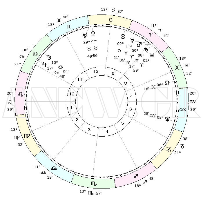 | | ΘΕΣΕΙΣ ΠΛΑΝΗΤΩΝ ΑΣΤΡΟΛΟΓΙΚΟΥ ΧΑΡΤΗ ΤΗΣ ΣΤΙΓΜΗΣ ΑΥΤΗΣ | | | | Πλανήτης | Ζώδιο | Μοίρες | Δεκαήμ. | Σε οίκο | Απόκλιση | | Ακμές των οίκων | | Ηλιος | Ταύρος | 02°17' | Πρώτο | 10 | 12 N 16 | | 1ος | 02°57' | Λέων | | Σελήνη | Καρκίνος | 10°02' | Δεύτερο | 12 | 27 N 20 | | 2ος | 24°12' | Λέων | | Ερμής | Κριός | 11°01' | Δεύτερο | 9 | 02 N 00 | | 3ος | 19°39' | Παρθένος | | Αφροδίτη | Ταύρος | 27°52' | Τρίτο | 11 | 20 N 11 | | 4ος | 21°02' | Ζυγός | | Αρης | Κριός | 09°46' | Πρώτο | 9 | 03 N 00 | | 5ος | 26°59' | Σκορπιός | | Δίας | Καρκίνος | 17°48' | Δεύτερο | 12 | 22 N 38 | | 6ος | 02°12' | Αιγόκερως | | Κρόνος | Κριός | 08°16' | Πρώτο | 9 | 01 N 18 | | 7ος | 02°57' | Υδροχόος | | Ουρανός | Ταύρος | 29°49' | Τρίτο | 11 | 19 N 57 | | 8ος | 24°12' | Υδροχόος | | Ποσειδώνας | Κριός | 02°59' | Πρώτο | 9 | 00 S 01 | | 9ος | 19°39' | Ιχθείς | | Πλούτωνας | Υδροχόος | 05°28' | Πρώτο | 7 | 22 S 48 | | 10ος | 21°02' | Κριός | | Β. Δεσμός | Ιχθείς | 06°16' | Πρώτο | 8 | 09 S 13 | | 11ος | 26°59' | Ταύρος | | Ωροσκόπος | Λέων | 02°57' | Πρώτο | | | 12ος | 02°12' | Καρκίνος | | Μεσουράνημα | Κριός | 21°02' | Τρίτο | | | |