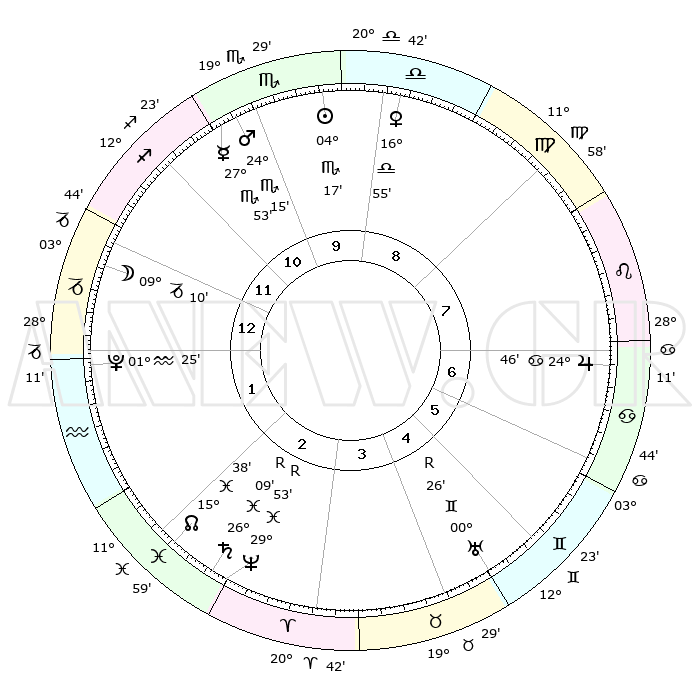 | | ΘΕΣΕΙΣ ΠΛΑΝΗΤΩΝ ΑΣΤΡΟΛΟΓΙΚΟΥ ΧΑΡΤΗ ΤΗΣ ΣΤΙΓΜΗΣ ΑΥΤΗΣ | | | | Πλανήτης | Ζώδιο | Μοίρες | Δεκαήμ. | Σε οίκο | Απόκλιση | | Ακμές των οίκων | | Ηλιος | Σκορπιός | 04°11' | Πρώτο | 10 | 12 S 55 | | 1ος | 21°54' | Τοξότης | | Σελήνη | Αιγόκερως | 07°56' | Πρώτο | 1 | 27 S 59 | | 2ος | 27°05' | Αιγόκερως | | Ερμής | Σκορπιός | 27°47' | Τρίτο | 11 | 22 S 21 | | 3ος | 06°16' | Ιχθείς | | Αφροδίτη | Ζυγός | 16°47' | Δεύτερο | 10 | 05 S 12 | | 4ος | 11°20' | Κριός | | Αρης | Σκορπιός | 24°11' | Τρίτο | 11 | 19 S 09 | | 5ος | 08°59' | Ταύρος | | Δίας | Καρκίνος | 24°46' | Τρίτο | 7 | 21 N 14 | | 6ος | 01°26' | Δίδυμοι | | Κρόνος | Ιχθείς | 26°09'R | Τρίτο | 3 | 03 S 48 | | 7ος | 21°54' | Δίδυμοι | | Ουρανός | Δίδυμοι | 00°27'R | Πρώτο | 5 | 20 N 02 | | 8ος | 27°05' | Καρκίνος | | Ποσειδώνας | Ιχθείς | 29°53'R | Τρίτο | 3 | 01 S 18 | | 9ος | 06°16' | Παρθένος | | Πλούτωνας | Υδροχόος | 01°25' | Πρώτο | 2 | 23 S 31 | | 10ος | 11°20' | Ζυγός | | Β. Δεσμός | Ιχθείς | 15°39' | Δεύτερο | 3 | 05 S 39 | | 11ος | 08°59' | Σκορπιός | | Ωροσκόπος | Τοξότης | 21°54' | Τρίτο | | | 12ος | 01°26' | Τοξότης | | Μεσουράνημα | Ζυγός | 11°20' | Δεύτερο | | | |