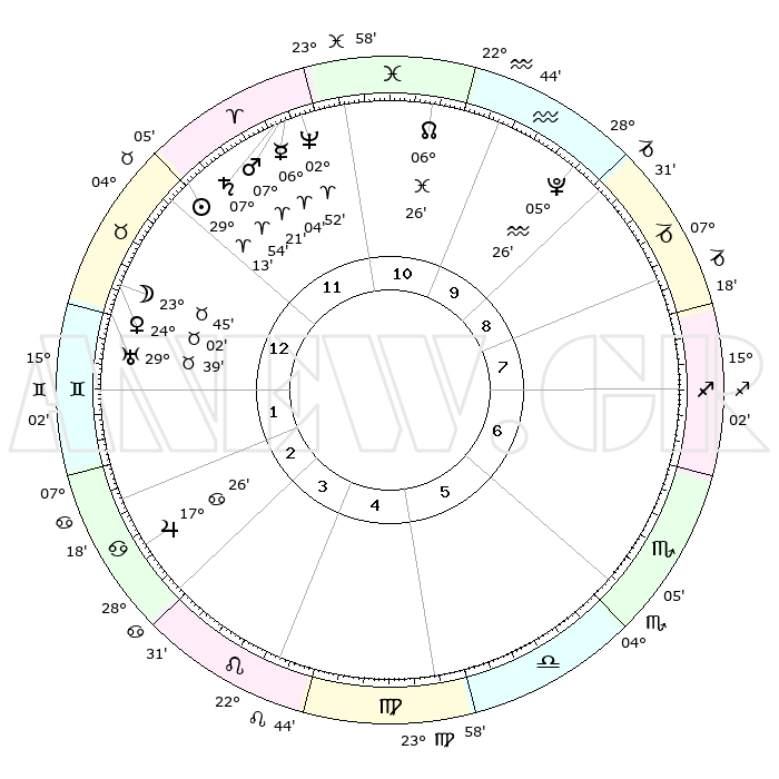 | | ΘΕΣΕΙΣ ΠΛΑΝΗΤΩΝ ΑΣΤΡΟΛΟΓΙΚΟΥ ΧΑΡΤΗ ΤΗΣ ΣΤΙΓΜΗΣ ΑΥΤΗΣ | | | | Πλανήτης | Ζώδιο | Μοίρες | Δεκαήμ. | Σε οίκο | Απόκλιση | | Ακμές των οίκων | | Ηλιος | Κριός | 29°09' | Τρίτο | 12 | 11 N 10 | | 1ος | 19°38' | Ταύρος | | Σελήνη | Ταύρος | 22°50' | Τρίτο | 1 | 23 N 15 | | 2ος | 16°44' | Δίδυμοι | | Ερμής | Κριός | 05°58' | Πρώτο | 12 | 00 S 03 | | 3ος | 08°39' | Καρκίνος | | Αφροδίτη | Ταύρος | 23°57' | Τρίτο | 1 | 19 N 07 | | 4ος | 00°48' | Λέων | | Αρης | Κριός | 07°18' | Πρώτο | 12 | 02 N 01 | | 5ος | 27°37' | Λέων | | Δίας | Καρκίνος | 17°25' | Δεύτερο | 3 | 22 N 41 | | 6ος | 04°14' | Ζυγός | | Κρόνος | Κριός | 07°53' | Πρώτο | 12 | 01 N 09 | | 7ος | 19°38' | Σκορπιός | | Ουρανός | Ταύρος | 29°38' | Τρίτο | 1 | 19 N 54 | | 8ος | 16°44' | Τοξότης | | Ποσειδώνας | Κριός | 02°52' | Πρώτο | 11 | 00 S 04 | | 9ος | 08°39' | Αιγόκερως | | Πλούτωνας | Υδροχόος | 05°26' | Πρώτο | 10 | 22 S 47 | | 10ος | 00°48' | Υδροχόος | | Β. Δεσμός | Ιχθείς | 06°26' | Πρώτο | 11 | 09 S 09 | | 11ος | 27°37' | Υδροχόος | | Ωροσκόπος | Ταύρος | 19°38' | Δεύτερο | | | 12ος | 04°14' | Κριός | | Μεσουράνημα | Υδροχόος | 00°48' | Πρώτο | | | |