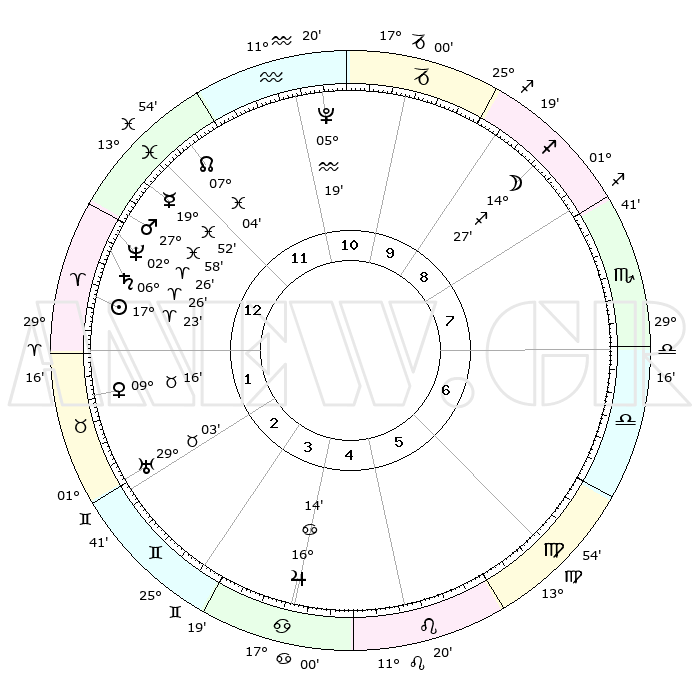 | | ΘΕΣΕΙΣ ΠΛΑΝΗΤΩΝ ΑΣΤΡΟΛΟΓΙΚΟΥ ΧΑΡΤΗ ΤΗΣ ΣΤΙΓΜΗΣ ΑΥΤΗΣ | | | | Πλανήτης | Ζώδιο | Μοίρες | Δεκαήμ. | Σε οίκο | Απόκλιση | | Ακμές των οίκων | | Ηλιος | Κριός | 17°20' | Δεύτερο | 1 | 06 N 48 | | 1ος | 25°43' | Ιχθείς | | Σελήνη | Τοξότης | 13°46' | Δεύτερο | 9 | 27 S 33 | | 2ος | 07°01' | Ταύρος | | Ερμής | Ιχθείς | 19°48' | Δεύτερο | 12 | 05 S 57 | | 3ος | 05°05' | Δίδυμοι | | Αφροδίτη | Ταύρος | 09°12' | Πρώτο | 2 | 14 N 23 | | 4ος | 27°36' | Δίδυμοι | | Αρης | Ιχθείς | 27°55' | Τρίτο | 1 | 01 S 46 | | 5ος | 19°43' | Καρκίνος | | Δίας | Καρκίνος | 16°14' | Δεύτερο | 4 | 22 N 49 | | 6ος | 16°29' | Λέων | | Κρόνος | Κριός | 06°25' | Πρώτο | 1 | 00 N 35 | | 7ος | 25°43' | Παρθένος | | Ουρανός | Ταύρος | 29°02' | Τρίτο | 2 | 19 N 46 | | 8ος | 07°01' | Σκορπιός | | Ποσειδώνας | Κριός | 02°26' | Πρώτο | 1 | 00 S 14 | | 9ος | 05°05' | Τοξότης | | Πλούτωνας | Υδροχόος | 05°18' | Πρώτο | 11 | 22 S 47 | | 10ος | 27°36' | Τοξότης | | Β. Δεσμός | Ιχθείς | 07°05' | Πρώτο | 12 | 08 S 55 | | 11ος | 19°43' | Αιγόκερως | | Ωροσκόπος | Ιχθείς | 25°43' | Τρίτο | | | 12ος | 16°29' | Υδροχόος | | Μεσουράνημα | Τοξότης | 27°36' | Τρίτο | | | |