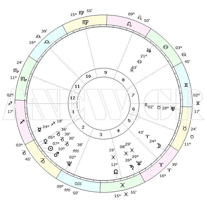 | | ΘΕΣΕΙΣ ΠΛΑΝΗΤΩΝ ΑΣΤΡΟΛΟΓΙΚΟΥ ΧΑΡΤΗ ΤΗΣ ΣΤΙΓΜΗΣ ΑΥΤΗΣ | | | | Πλανήτης | Ζώδιο | Μοίρες | Δεκαήμ. | Σε οίκο | Απόκλιση | | Ακμές των οίκων | | Ηλιος | Αιγόκερως | 07°34' | Πρώτο | 2 | 23 S 13 | | 1ος | 10°42' | Σκορπιός | | Σελήνη | Κριός | 23°40' | Τρίτο | 6 | 12 N 22 | | 2ος | 09°50' | Τοξότης | | Ερμής | Τοξότης | 24°11' | Τρίτο | 2 | 23 S 32 | | 3ος | 12°49' | Αιγόκερως | | Αφροδίτη | Αιγόκερως | 05°30' | Πρώτο | 2 | 23 S 43 | | 4ος | 17°46' | Υδροχόος | | Αρης | Αιγόκερως | 10°26' | Δεύτερο | 2 | 23 S 54 | | 5ος | 20°25' | Ιχθείς | | Δίας | Καρκίνος | 21°44'R | Τρίτο | 9 | 21 N 54 | | 6ος | 17°58' | Κριός | | Κρόνος | Ιχθείς | 26°07' | Τρίτο | 5 | 03 S 38 | | 7ος | 10°42' | Ταύρος | | Ουρανός | Ταύρος | 28°02'R | Τρίτο | 7 | 19 N 31 | | 8ος | 09°50' | Δίδυμοι | | Ποσειδώνας | Ιχθείς | 29°28' | Τρίτο | 5 | 01 S 26 | | 9ος | 12°49' | Καρκίνος | | Πλούτωνας | Υδροχόος | 02°38' | Πρώτο | 3 | 23 S 14 | | 10ος | 17°46' | Λέων | | Β. Δεσμός | Ιχθείς | 12°19' | Δεύτερο | 4 | 06 S 56 | | 11ος | 20°25' | Παρθένος | | Ωροσκόπος | Σκορπιός | 10°42' | Δεύτερο | | | 12ος | 17°58' | Ζυγός | | Μεσουράνημα | Λέων | 17°46' | Δεύτερο | | | |