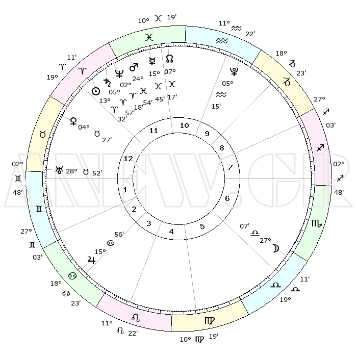 | | ΘΕΣΕΙΣ ΠΛΑΝΗΤΩΝ ΑΣΤΡΟΛΟΓΙΚΟΥ ΧΑΡΤΗ ΤΗΣ ΣΤΙΓΜΗΣ ΑΥΤΗΣ | | | | Πλανήτης | Ζώδιο | Μοίρες | Δεκαήμ. | Σε οίκο | Απόκλιση | | Ακμές των οίκων | | Ηλιος | Κριός | 13°27' | Δεύτερο | 12 | 05 N 19 | | 1ος | 29°44' | Κριός | | Σελήνη | Ζυγός | 26°16' | Τρίτο | 6 | 13 S 42 | | 2ος | 02°02' | Δίδυμοι | | Ερμής | Ιχθείς | 15°41' | Δεύτερο | 12 | 07 S 08 | | 3ος | 25°37' | Δίδυμοι | | Αφροδίτη | Ταύρος | 04°22' | Πρώτο | 1 | 12 N 38 | | 4ος | 17°18' | Καρκίνος | | Αρης | Ιχθείς | 24°51' | Τρίτο | 12 | 03 S 00 | | 5ος | 11°41' | Λέων | | Δίας | Καρκίνος | 15°56' | Δεύτερο | 3 | 22 N 51 | | 6ος | 14°20' | Παρθένος | | Κρόνος | Κριός | 05°56' | Πρώτο | 12 | 00 N 24 | | 7ος | 29°44' | Ζυγός | | Ουρανός | Ταύρος | 28°52' | Τρίτο | 1 | 19 N 44 | | 8ος | 02°02' | Τοξότης | | Ποσειδώνας | Κριός | 02°18' | Πρώτο | 12 | 00 S 17 | | 9ος | 25°37' | Τοξότης | | Πλούτωνας | Υδροχόος | 05°15' | Πρώτο | 10 | 22 S 47 | | 10ος | 17°18' | Αιγόκερως | | Β. Δεσμός | Ιχθείς | 07°17' | Πρώτο | 11 | 08 S 50 | | 11ος | 11°41' | Υδροχόος | | Ωροσκόπος | Κριός | 29°44' | Τρίτο | | | 12ος | 14°20' | Ιχθείς | | Μεσουράνημα | Αιγόκερως | 17°18' | Δεύτερο | | | |