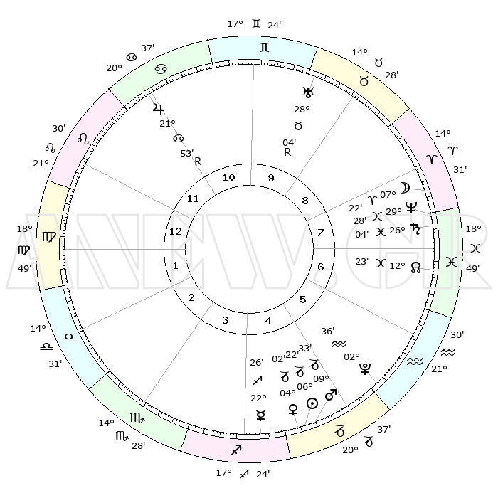 | | ΘΕΣΕΙΣ ΠΛΑΝΗΤΩΝ ΑΣΤΡΟΛΟΓΙΚΟΥ ΧΑΡΤΗ ΤΗΣ ΣΤΙΓΜΗΣ ΑΥΤΗΣ | | | | Πλανήτης | Ζώδιο | Μοίρες | Δεκαήμ. | Σε οίκο | Απόκλιση | | Ακμές των οίκων | | Ηλιος | Αιγόκερως | 06°18' | Πρώτο | 5 | 23 S 17 | | 1ος | 26°53' | Λέων | | Σελήνη | Κριός | 06°20' | Πρώτο | 8 | 04 N 30 | | 2ος | 20°25' | Παρθένος | | Ερμής | Τοξότης | 22°19' | Τρίτο | 4 | 23 S 18 | | 3ος | 18°47' | Ζυγός | | Αφροδίτη | Αιγόκερως | 03°56' | Πρώτο | 5 | 23 S 43 | | 4ος | 21°39' | Σκορπιός | | Αρης | Αιγόκερως | 09°29' | Πρώτο | 5 | 23 S 57 | | 5ος | 26°04' | Τοξότης | | Δίας | Καρκίνος | 21°54'R | Τρίτο | 11 | 21 N 53 | | 6ος | 28°17' | Αιγόκερως | | Κρόνος | Ιχθείς | 26°03' | Τρίτο | 8 | 03 S 39 | | 7ος | 26°53' | Υδροχόος | | Ουρανός | Ταύρος | 28°04'R | Τρίτο | 10 | 19 N 32 | | 8ος | 20°25' | Ιχθείς | | Ποσειδώνας | Ιχθείς | 29°28' | Τρίτο | 8 | 01 S 26 | | 9ος | 18°47' | Κριός | | Πλούτωνας | Υδροχόος | 02°36' | Πρώτο | 6 | 23 S 15 | | 10ος | 21°39' | Ταύρος | | Β. Δεσμός | Ιχθείς | 12°23' | Δεύτερο | 7 | 06 S 55 | | 11ος | 26°04' | Δίδυμοι | | Ωροσκόπος | Λέων | 26°53' | Τρίτο | | | 12ος | 28°17' | Καρκίνος | | Μεσουράνημα | Ταύρος | 21°39' | Τρίτο | | | |