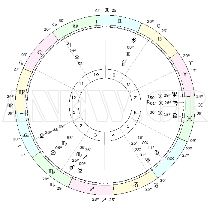 | | ΘΕΣΕΙΣ ΠΛΑΝΗΤΩΝ ΑΣΤΡΟΛΟΓΙΚΟΥ ΧΑΡΤΗ ΤΗΣ ΣΤΙΓΜΗΣ ΑΥΤΗΣ | | | | Πλανήτης | Ζώδιο | Μοίρες | Δεκαήμ. | Σε οίκο | Απόκλιση | | Ακμές των οίκων | | Ηλιος | Σκορπιός | 06°24' | Πρώτο | 7 | 13 S 39 | | 1ος | 29°46' | Ιχθείς | | Σελήνη | Υδροχόος | 05°12' | Πρώτο | 11 | 22 S 17 | | 2ος | 10°07' | Ταύρος | | Ερμής | Τοξότης | 00°08' | Πρώτο | 8 | 22 S 58 | | 3ος | 07°33' | Δίδυμοι | | Αφροδίτη | Ζυγός | 19°33' | Δεύτερο | 7 | 06 S 16 | | 4ος | 29°52' | Δίδυμοι | | Αρης | Σκορπιός | 25°45' | Τρίτο | 8 | 19 S 33 | | 5ος | 22°10' | Καρκίνος | | Δίας | Καρκίνος | 24°52' | Τρίτο | 5 | 21 N 14 | | 6ος | 19°32' | Λέων | | Κρόνος | Ιχθείς | 26°02'R | Τρίτο | 12 | 03 S 51 | | 7ος | 29°46' | Παρθένος | | Ουρανός | Δίδυμοι | 00°22'R | Πρώτο | 2 | 20 N 01 | | 8ος | 10°07' | Σκορπιός | | Ποσειδώνας | Ιχθείς | 29°50'R | Τρίτο | 1 | 01 S 19 | | 9ος | 07°33' | Τοξότης | | Πλούτωνας | Υδροχόος | 01°25' | Πρώτο | 11 | 23 S 31 | | 10ος | 29°52' | Τοξότης | | Β. Δεσμός | Ιχθείς | 15°32' | Δεύτερο | 12 | 05 S 42 | | 11ος | 22°10' | Αιγόκερως | | Ωροσκόπος | Ιχθείς | 29°46' | Τρίτο | | | 12ος | 19°32' | Υδροχόος | | Μεσουράνημα | Τοξότης | 29°52' | Τρίτο | | | |