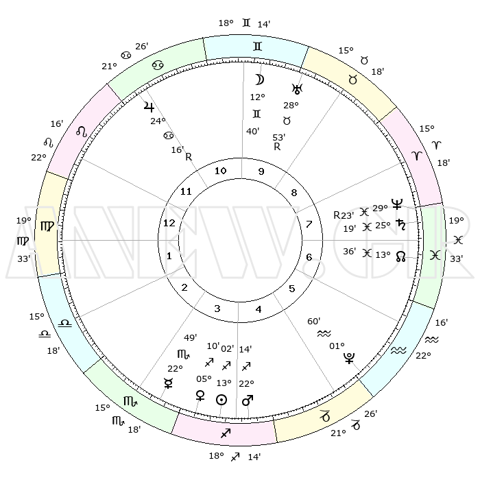 | | ΘΕΣΕΙΣ ΠΛΑΝΗΤΩΝ ΑΣΤΡΟΛΟΓΙΚΟΥ ΧΑΡΤΗ ΤΗΣ ΣΤΙΓΜΗΣ ΑΥΤΗΣ | | | | Πλανήτης | Ζώδιο | Μοίρες | Δεκαήμ. | Σε οίκο | Απόκλιση | | Ακμές των οίκων | | Ηλιος | Τοξότης | 13°00' | Δεύτερο | 4 | 22 S 21 | | 1ος | 08°45' | Παρθένος | | Σελήνη | Δίδυμοι | 12°06' | Δεύτερο | 10 | 27 N 11 | | 2ος | 03°30' | Ζυγός | | Ερμής | Σκορπιός | 22°48' | Τρίτο | 3 | 16 S 00 | | 3ος | 02°52' | Σκορπιός | | Αφροδίτη | Τοξότης | 05°07' | Πρώτο | 3 | 20 S 36 | | 4ος | 05°49' | Τοξότης | | Αρης | Τοξότης | 22°13' | Τρίτο | 4 | 23 S 54 | | 5ος | 09°28' | Αιγόκερως | | Δίας | Καρκίνος | 24°16'R | Τρίτο | 11 | 21 N 25 | | 6ος | 10°50' | Υδροχόος | | Κρόνος | Ιχθείς | 25°19' | Τρίτο | 7 | 04 S 01 | | 7ος | 08°45' | Ιχθείς | | Ουρανός | Ταύρος | 28°53'R | Τρίτο | 9 | 19 N 42 | | 8ος | 03°30' | Κριός | | Ποσειδώνας | Ιχθείς | 29°23'R | Τρίτο | 7 | 01 S 29 | | 9ος | 02°52' | Ταύρος | | Πλούτωνας | Υδροχόος | 01°60' | Πρώτο | 5 | 23 S 23 | | 10ος | 05°49' | Δίδυμοι | | Β. Δεσμός | Ιχθείς | 13°36' | Δεύτερο | 7 | 06 S 27 | | 11ος | 09°28' | Καρκίνος | | Ωροσκόπος | Παρθένος | 08°45' | Πρώτο | | | 12ος | 10°50' | Λέων | | Μεσουράνημα | Δίδυμοι | 05°49' | Πρώτο | | | |