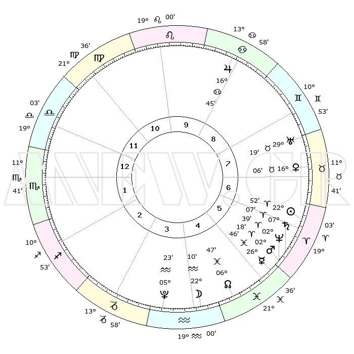 | | ΘΕΣΕΙΣ ΠΛΑΝΗΤΩΝ ΑΣΤΡΟΛΟΓΙΚΟΥ ΧΑΡΤΗ ΤΗΣ ΣΤΙΓΜΗΣ ΑΥΤΗΣ | | | | Πλανήτης | Ζώδιο | Μοίρες | Δεκαήμ. | Σε οίκο | Απόκλιση | | Ακμές των οίκων | | Ηλιος | Κριός | 22°47' | Τρίτο | 7 | 08 N 52 | | 1ος | 20°16' | Ζυγός | | Σελήνη | Υδροχόος | 21°14' | Τρίτο | 4 | 15 S 51 | | 2ος | 18°07' | Σκορπιός | | Ερμής | Ιχθείς | 26°40' | Τρίτο | 6 | 03 S 37 | | 3ος | 19°25' | Τοξότης | | Αφροδίτη | Ταύρος | 16°01' | Δεύτερο | 7 | 16 N 41 | | 4ος | 23°02' | Αιγόκερως | | Αρης | Κριός | 02°15' | Πρώτο | 6 | 00 S 01 | | 5ος | 25°59' | Υδροχόος | | Δίας | Καρκίνος | 16°44' | Δεύτερο | 9 | 22 N 46 | | 6ος | 25°25' | Ιχθείς | | Κρόνος | Κριός | 07°06' | Πρώτο | 6 | 00 N 51 | | 7ος | 20°16' | Κριός | | Ουρανός | Ταύρος | 29°19' | Τρίτο | 8 | 19 N 50 | | 8ος | 18°07' | Ταύρος | | Ποσειδώνας | Κριός | 02°38' | Πρώτο | 6 | 00 S 09 | | 9ος | 19°25' | Δίδυμοι | | Πλούτωνας | Υδροχόος | 05°23' | Πρώτο | 4 | 22 S 47 | | 10ος | 23°02' | Καρκίνος | | Β. Δεσμός | Ιχθείς | 06°47' | Πρώτο | 5 | 09 S 01 | | 11ος | 25°59' | Λέων | | Ωροσκόπος | Ζυγός | 20°16' | Τρίτο | | | 12ος | 25°25' | Παρθένος | | Μεσουράνημα | Καρκίνος | 23°02' | Τρίτο | | | |