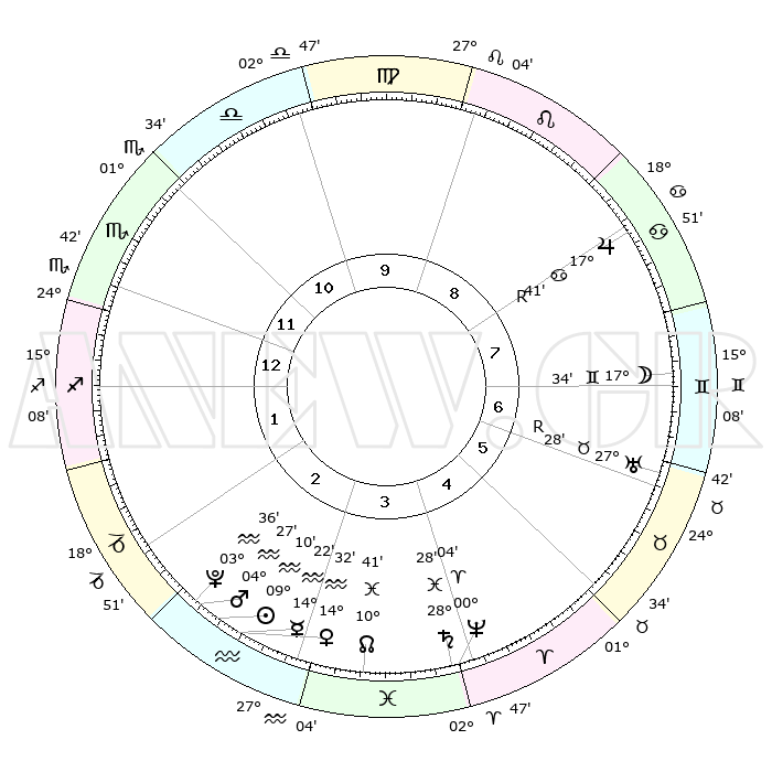 | | ΘΕΣΕΙΣ ΠΛΑΝΗΤΩΝ ΑΣΤΡΟΛΟΓΙΚΟΥ ΧΑΡΤΗ ΤΗΣ ΣΤΙΓΜΗΣ ΑΥΤΗΣ | | | | Πλανήτης | Ζώδιο | Μοίρες | Δεκαήμ. | Σε οίκο | Απόκλιση | | Ακμές των οίκων | | Ηλιος | Υδροχόος | 09°06' | Πρώτο | 3 | 17 S 59 | | 1ος | 23°45' | Σκορπιός | | Σελήνη | Δίδυμοι | 16°31' | Δεύτερο | 7 | 27 N 53 | | 2ος | 24°06' | Τοξότης | | Ερμής | Υδροχόος | 14°14' | Δεύτερο | 3 | 18 S 29 | | 3ος | 28°49' | Αιγόκερως | | Αφροδίτη | Υδροχόος | 14°26' | Δεύτερο | 3 | 17 S 45 | | 4ος | 04°38' | Ιχθείς | | Αρης | Υδροχόος | 04°24' | Πρώτο | 3 | 20 S 09 | | 5ος | 06°21' | Κριός | | Δίας | Καρκίνος | 17°42'R | Δεύτερο | 8 | 22 N 34 | | 6ος | 02°15' | Ταύρος | | Κρόνος | Ιχθείς | 28°28' | Τρίτο | 4 | 02 S 37 | | 7ος | 23°45' | Ταύρος | | Ουρανός | Ταύρος | 27°28'R | Τρίτο | 7 | 19 N 24 | | 8ος | 24°06' | Δίδυμοι | | Ποσειδώνας | Κριός | 00°04' | Πρώτο | 4 | 01 S 11 | | 9ος | 28°49' | Καρκίνος | | Πλούτωνας | Υδροχόος | 03°36' | Πρώτο | 3 | 23 S 02 | | 10ος | 04°38' | Παρθένος | | Β. Δεσμός | Ιχθείς | 10°41' | Δεύτερο | 4 | 07 S 33 | | 11ος | 06°21' | Ζυγός | | Ωροσκόπος | Σκορπιός | 23°45' | Τρίτο | | | 12ος | 02°15' | Σκορπιός | | Μεσουράνημα | Παρθένος | 04°38' | Πρώτο | | | |
