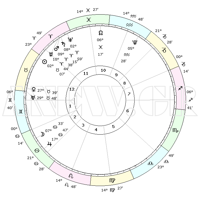 | | ΘΕΣΕΙΣ ΠΛΑΝΗΤΩΝ ΑΣΤΡΟΛΟΓΙΚΟΥ ΧΑΡΤΗ ΤΗΣ ΣΤΙΓΜΗΣ ΑΥΤΗΣ | | | | Πλανήτης | Ζώδιο | Μοίρες | Δεκαήμ. | Σε οίκο | Απόκλιση | | Ακμές των οίκων | | Ηλιος | Ταύρος | 02°03' | Πρώτο | 12 | 12 N 11 | | 1ος | 05°31' | Ταύρος | | Σελήνη | Καρκίνος | 06°35' | Πρώτο | 3 | 27 N 43 | | 2ος | 06°14' | Δίδυμοι | | Ερμής | Κριός | 10°37' | Δεύτερο | 12 | 01 N 50 | | 3ος | 29°15' | Δίδυμοι | | Αφροδίτη | Ταύρος | 27°34' | Τρίτο | 1 | 20 N 06 | | 4ος | 20°59' | Καρκίνος | | Αρης | Κριός | 09°35' | Πρώτο | 12 | 02 N 56 | | 5ος | 15°58' | Λέων | | Δίας | Καρκίνος | 17°46' | Δεύτερο | 3 | 22 N 38 | | 6ος | 19°47' | Παρθένος | | Κρόνος | Κριός | 08°14' | Πρώτο | 12 | 01 N 17 | | 7ος | 05°31' | Σκορπιός | | Ουρανός | Ταύρος | 29°48' | Τρίτο | 1 | 19 N 56 | | 8ος | 06°14' | Τοξότης | | Ποσειδώνας | Κριός | 02°58' | Πρώτο | 12 | 00 S 02 | | 9ος | 29°15' | Τοξότης | | Πλούτωνας | Υδροχόος | 05°28' | Πρώτο | 10 | 22 S 48 | | 10ος | 20°59' | Αιγόκερως | | Β. Δεσμός | Ιχθείς | 06°17' | Πρώτο | 11 | 09 S 12 | | 11ος | 15°58' | Υδροχόος | | Ωροσκόπος | Ταύρος | 05°31' | Πρώτο | | | 12ος | 19°47' | Ιχθείς | | Μεσουράνημα | Αιγόκερως | 20°59' | Τρίτο | | | |