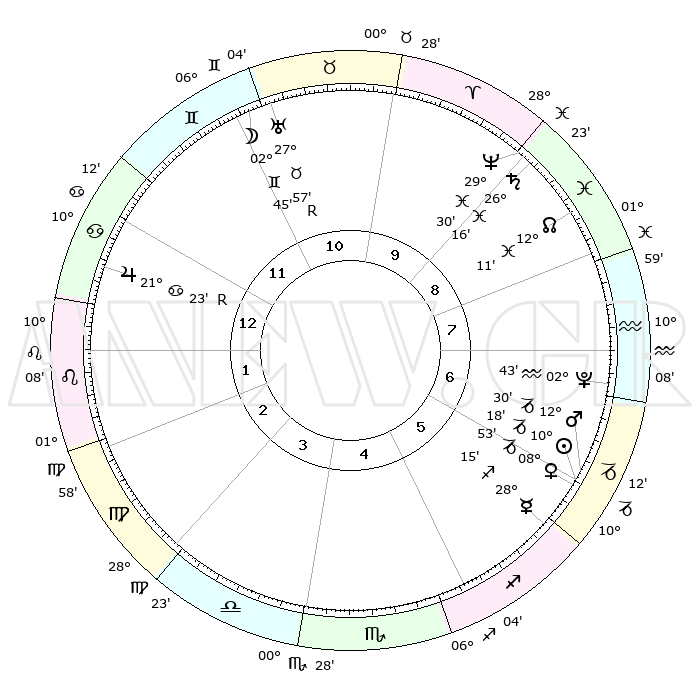 | | ΘΕΣΕΙΣ ΠΛΑΝΗΤΩΝ ΑΣΤΡΟΛΟΓΙΚΟΥ ΧΑΡΤΗ ΤΗΣ ΣΤΙΓΜΗΣ ΑΥΤΗΣ | | | | Πλανήτης | Ζώδιο | Μοίρες | Δεκαήμ. | Σε οίκο | Απόκλιση | | Ακμές των οίκων | | Ηλιος | Αιγόκερως | 10°14' | Δεύτερο | 6 | 23 S 02 | | 1ος | 19°21' | Καρκίνος | | Σελήνη | Δίδυμοι | 01°42' | Πρώτο | 11 | 25 N 23 | | 2ος | 09°52' | Λέων | | Ερμής | Τοξότης | 28°09' | Τρίτο | 6 | 23 S 57 | | 3ος | 03°32' | Παρθένος | | Αφροδίτη | Αιγόκερως | 08°48' | Πρώτο | 6 | 23 S 38 | | 4ος | 03°02' | Ζυγός | | Αρης | Αιγόκερως | 12°26' | Δεύτερο | 6 | 23 S 44 | | 5ος | 09°00' | Σκορπιός | | Δίας | Καρκίνος | 21°24'R | Τρίτο | 1 | 21 N 58 | | 6ος | 16°30' | Τοξότης | | Κρόνος | Ιχθείς | 26°16' | Τρίτο | 9 | 03 S 34 | | 7ος | 19°21' | Αιγόκερως | | Ουρανός | Ταύρος | 27°57'R | Τρίτο | 11 | 19 N 30 | | 8ος | 09°52' | Υδροχόος | | Ποσειδώνας | Ιχθείς | 29°30' | Τρίτο | 9 | 01 S 25 | | 9ος | 03°32' | Ιχθείς | | Πλούτωνας | Υδροχόος | 02°43' | Πρώτο | 7 | 23 S 13 | | 10ος | 03°02' | Κριός | | Β. Δεσμός | Ιχθείς | 12°11' | Δεύτερο | 9 | 06 S 59 | | 11ος | 09°00' | Ταύρος | | Ωροσκόπος | Καρκίνος | 19°21' | Δεύτερο | | | 12ος | 16°30' | Δίδυμοι | | Μεσουράνημα | Κριός | 03°02' | Πρώτο | | | |