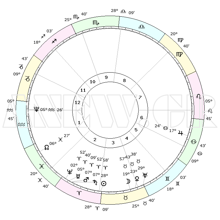 | | ΘΕΣΕΙΣ ΠΛΑΝΗΤΩΝ ΑΣΤΡΟΛΟΓΙΚΟΥ ΧΑΡΤΗ ΤΗΣ ΣΤΙΓΜΗΣ ΑΥΤΗΣ | | | | Πλανήτης | Ζώδιο | Μοίρες | Δεκαήμ. | Σε οίκο | Απόκλιση | | Ακμές των οίκων | | Ηλιος | Κριός | 28°55' | Τρίτο | 3 | 11 N 05 | | 1ος | 11°16' | Αιγόκερως | | Σελήνη | Ταύρος | 19°02' | Δεύτερο | 4 | 22 N 07 | | 2ος | 21°17' | Υδροχόος | | Ερμής | Κριός | 05°35' | Πρώτο | 3 | 00 S 12 | | 3ος | 01°33' | Κριός | | Αφροδίτη | Ταύρος | 23°39' | Τρίτο | 4 | 19 N 01 | | 4ος | 03°30' | Ταύρος | | Αρης | Κριός | 07°06' | Πρώτο | 3 | 01 N 56 | | 5ος | 28°10' | Ταύρος | | Δίας | Καρκίνος | 17°24' | Δεύτερο | 7 | 22 N 41 | | 6ος | 19°28' | Δίδυμοι | | Κρόνος | Κριός | 07°52' | Πρώτο | 3 | 01 N 08 | | 7ος | 11°16' | Καρκίνος | | Ουρανός | Ταύρος | 29°38' | Τρίτο | 5 | 19 N 54 | | 8ος | 21°17' | Λέων | | Ποσειδώνας | Κριός | 02°52' | Πρώτο | 3 | 00 S 04 | | 9ος | 01°33' | Ζυγός | | Πλούτωνας | Υδροχόος | 05°26' | Πρώτο | 1 | 22 S 47 | | 10ος | 03°30' | Σκορπιός | | Β. Δεσμός | Ιχθείς | 06°27' | Πρώτο | 2 | 09 S 08 | | 11ος | 28°10' | Σκορπιός | | Ωροσκόπος | Αιγόκερως | 11°16' | Δεύτερο | | | 12ος | 19°28' | Τοξότης | | Μεσουράνημα | Σκορπιός | 03°30' | Πρώτο | | | |