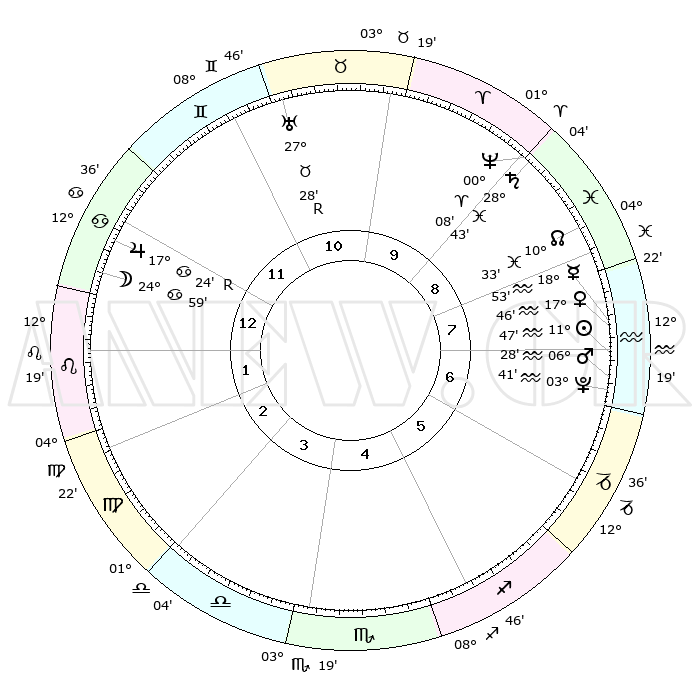 | | ΘΕΣΕΙΣ ΠΛΑΝΗΤΩΝ ΑΣΤΡΟΛΟΓΙΚΟΥ ΧΑΡΤΗ ΤΗΣ ΣΤΙΓΜΗΣ ΑΥΤΗΣ | | | | Πλανήτης | Ζώδιο | Μοίρες | Δεκαήμ. | Σε οίκο | Απόκλιση | | Ακμές των οίκων | | Ηλιος | Υδροχόος | 11°43' | Δεύτερο | 7 | 17 S 16 | | 1ος | 24°05' | Καρκίνος | | Σελήνη | Καρκίνος | 24°05' | Τρίτο | 12 | 24 N 56 | | 2ος | 14°47' | Λέων | | Ερμής | Υδροχόος | 18°46' | Δεύτερο | 8 | 17 S 00 | | 3ος | 09°03' | Παρθένος | | Αφροδίτη | Υδροχόος | 17°41' | Δεύτερο | 8 | 16 S 49 | | 4ος | 09°17' | Ζυγός | | Αρης | Υδροχόος | 06°25' | Πρώτο | 7 | 19 S 40 | | 5ος | 15°22' | Σκορπιός | | Δίας | Καρκίνος | 17°24'R | Δεύτερο | 12 | 22 N 36 | | 6ος | 22°04' | Τοξότης | | Κρόνος | Ιχθείς | 28°43' | Τρίτο | 9 | 02 S 30 | | 7ος | 24°05' | Αιγόκερως | | Ουρανός | Ταύρος | 27°28'R | Τρίτο | 11 | 19 N 24 | | 8ος | 14°47' | Υδροχόος | | Ποσειδώνας | Κριός | 00°08' | Πρώτο | 9 | 01 S 09 | | 9ος | 09°03' | Ιχθείς | | Πλούτωνας | Υδροχόος | 03°41' | Πρώτο | 7 | 23 S 01 | | 10ος | 09°17' | Κριός | | Β. Δεσμός | Ιχθείς | 10°33' | Δεύτερο | 9 | 07 S 37 | | 11ος | 15°22' | Ταύρος | | Ωροσκόπος | Καρκίνος | 24°05' | Τρίτο | | | 12ος | 22°04' | Δίδυμοι | | Μεσουράνημα | Κριός | 09°17' | Πρώτο | | | |