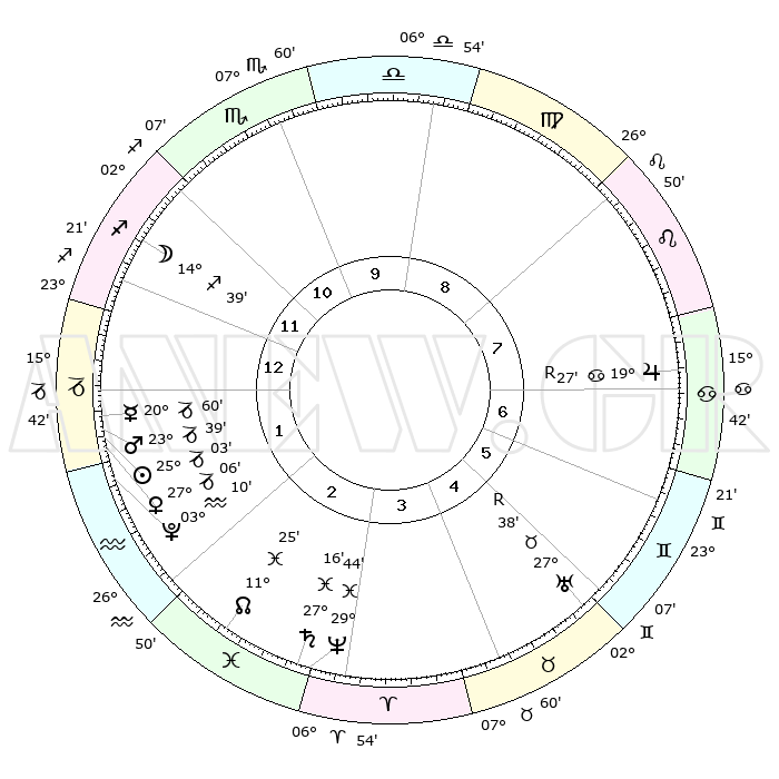| | ΘΕΣΕΙΣ ΠΛΑΝΗΤΩΝ ΑΣΤΡΟΛΟΓΙΚΟΥ ΧΑΡΤΗ ΤΗΣ ΣΤΙΓΜΗΣ ΑΥΤΗΣ | | | | Πλανήτης | Ζώδιο | Μοίρες | Δεκαήμ. | Σε οίκο | Απόκλιση | | Ακμές των οίκων | | Ηλιος | Αιγόκερως | 24°59' | Τρίτο | 1 | 21 S 08 | | 1ος | 22°27' | Τοξότης | | Σελήνη | Τοξότης | 13°51' | Δεύτερο | 12 | 27 S 32 | | 2ος | 27°46' | Αιγόκερως | | Ερμής | Αιγόκερως | 20°53' | Τρίτο | 1 | 23 S 35 | | 3ος | 07°02' | Ιχθείς | | Αφροδίτη | Αιγόκερως | 27°01' | Τρίτο | 1 | 21 S 43 | | 4ος | 12°02' | Κριός | | Αρης | Αιγόκερως | 23°36' | Τρίτο | 1 | 22 S 20 | | 5ος | 09°35' | Ταύρος | | Δίας | Καρκίνος | 19°28'R | Δεύτερο | 7 | 22 N 17 | | 6ος | 01°59' | Δίδυμοι | | Κρόνος | Ιχθείς | 27°15' | Τρίτο | 3 | 03 S 08 | | 7ος | 22°27' | Δίδυμοι | | Ουρανός | Ταύρος | 27°38'R | Τρίτο | 5 | 19 N 26 | | 8ος | 27°46' | Καρκίνος | | Ποσειδώνας | Ιχθείς | 29°44' | Τρίτο | 3 | 01 S 19 | | 9ος | 07°02' | Παρθένος | | Πλούτωνας | Υδροχόος | 03°10' | Πρώτο | 2 | 23 S 08 | | 10ος | 12°02' | Ζυγός | | Β. Δεσμός | Ιχθείς | 11°25' | Δεύτερο | 3 | 07 S 17 | | 11ος | 09°35' | Σκορπιός | | Ωροσκόπος | Τοξότης | 22°27' | Τρίτο | | | 12ος | 01°59' | Τοξότης | | Μεσουράνημα | Ζυγός | 12°02' | Δεύτερο | | | |