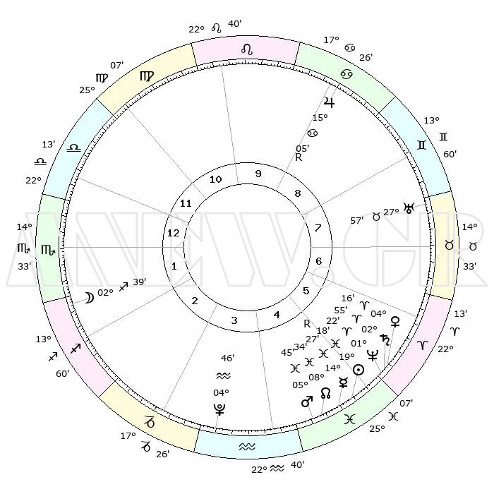 | | ΘΕΣΕΙΣ ΠΛΑΝΗΤΩΝ ΑΣΤΡΟΛΟΓΙΚΟΥ ΧΑΡΤΗ ΤΗΣ ΣΤΙΓΜΗΣ ΑΥΤΗΣ | | | | Πλανήτης | Ζώδιο | Μοίρες | Δεκαήμ. | Σε οίκο | Απόκλιση | | Ακμές των οίκων | | Ηλιος | Ιχθείς | 19°12' | Δεύτερο | 5 | 04 S 16 | | 1ος | 15°02' | Ζυγός | | Σελήνη | Τοξότης | 01°26' | Πρώτο | 2 | 25 S 34 | | 2ος | 12°35' | Σκορπιός | | Ερμής | Ιχθείς | 14°33'R | Δεύτερο | 5 | 02 S 56 | | 3ος | 13°38' | Τοξότης | | Αφροδίτη | Κριός | 04°09' | Πρώτο | 6 | 00 N 33 | | 4ος | 16°59' | Αιγόκερως | | Αρης | Ιχθείς | 05°40' | Πρώτο | 5 | 10 S 27 | | 5ος | 19°56' | Υδροχόος | | Δίας | Καρκίνος | 15°05'R | Δεύτερο | 9 | 22 N 56 | | 6ος | 19°41' | Ιχθείς | | Κρόνος | Κριός | 02°54' | Πρώτο | 6 | 00 S 48 | | 7ος | 15°02' | Κριός | | Ουρανός | Ταύρος | 27°57' | Τρίτο | 8 | 19 N 32 | | 8ος | 12°35' | Ταύρος | | Ποσειδώνας | Κριός | 01°22' | Πρώτο | 6 | 00 S 39 | | 9ος | 13°38' | Δίδυμοι | | Πλούτωνας | Υδροχόος | 04°46' | Πρώτο | 4 | 22 S 50 | | 10ος | 16°59' | Καρκίνος | | Β. Δεσμός | Ιχθείς | 08°35' | Πρώτο | 5 | 08 S 21 | | 11ος | 19°56' | Λέων | | Ωροσκόπος | Ζυγός | 15°02' | Δεύτερο | | | 12ος | 19°41' | Παρθένος | | Μεσουράνημα | Καρκίνος | 16°59' | Δεύτερο | | | |
