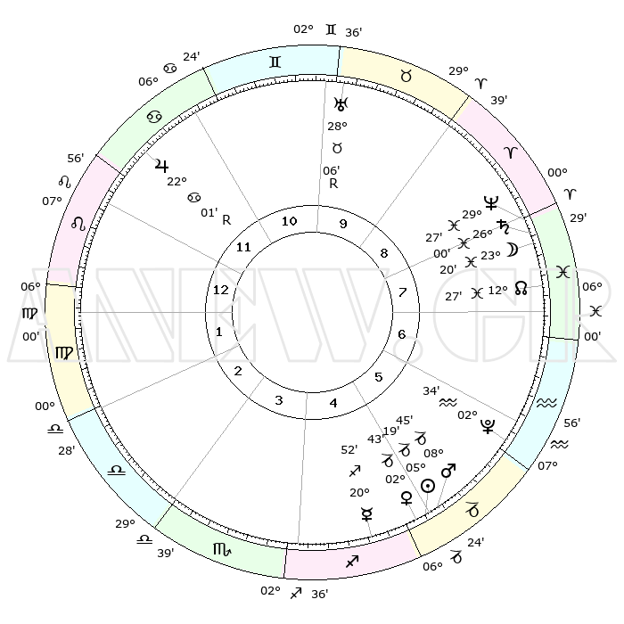 | | ΘΕΣΕΙΣ ΠΛΑΝΗΤΩΝ ΑΣΤΡΟΛΟΓΙΚΟΥ ΧΑΡΤΗ ΤΗΣ ΣΤΙΓΜΗΣ ΑΥΤΗΣ | | | | Πλανήτης | Ζώδιο | Μοίρες | Δεκαήμ. | Σε οίκο | Απόκλιση | | Ακμές των οίκων | | Ηλιος | Αιγόκερως | 05°14' | Πρώτο | 5 | 23 S 20 | | 1ος | 13°49' | Λέων | | Σελήνη | Ιχθείς | 22°19' | Τρίτο | 8 | 02 S 09 | | 2ος | 06°00' | Παρθένος | | Ερμής | Τοξότης | 20°45' | Τρίτο | 5 | 23 S 04 | | 3ος | 02°54' | Ζυγός | | Αφροδίτη | Αιγόκερως | 02°38' | Πρώτο | 5 | 23 S 43 | | 4ος | 05°15' | Σκορπιός | | Αρης | Αιγόκερως | 08°42' | Πρώτο | 5 | 24 S 00 | | 5ος | 10°36' | Τοξότης | | Δίας | Καρκίνος | 22°01'R | Τρίτο | 12 | 21 N 51 | | 6ος | 14°14' | Αιγόκερως | | Κρόνος | Ιχθείς | 26°00' | Τρίτο | 8 | 03 S 41 | | 7ος | 13°49' | Υδροχόος | | Ουρανός | Ταύρος | 28°06'R | Τρίτο | 10 | 19 N 32 | | 8ος | 06°00' | Ιχθείς | | Ποσειδώνας | Ιχθείς | 29°27' | Τρίτο | 8 | 01 S 27 | | 9ος | 02°54' | Κριός | | Πλούτωνας | Υδροχόος | 02°34' | Πρώτο | 6 | 23 S 15 | | 10ος | 05°15' | Ταύρος | | Β. Δεσμός | Ιχθείς | 12°27' | Δεύτερο | 8 | 06 S 53 | | 11ος | 10°36' | Δίδυμοι | | Ωροσκόπος | Λέων | 13°49' | Δεύτερο | | | 12ος | 14°14' | Καρκίνος | | Μεσουράνημα | Ταύρος | 05°15' | Πρώτο | | | |